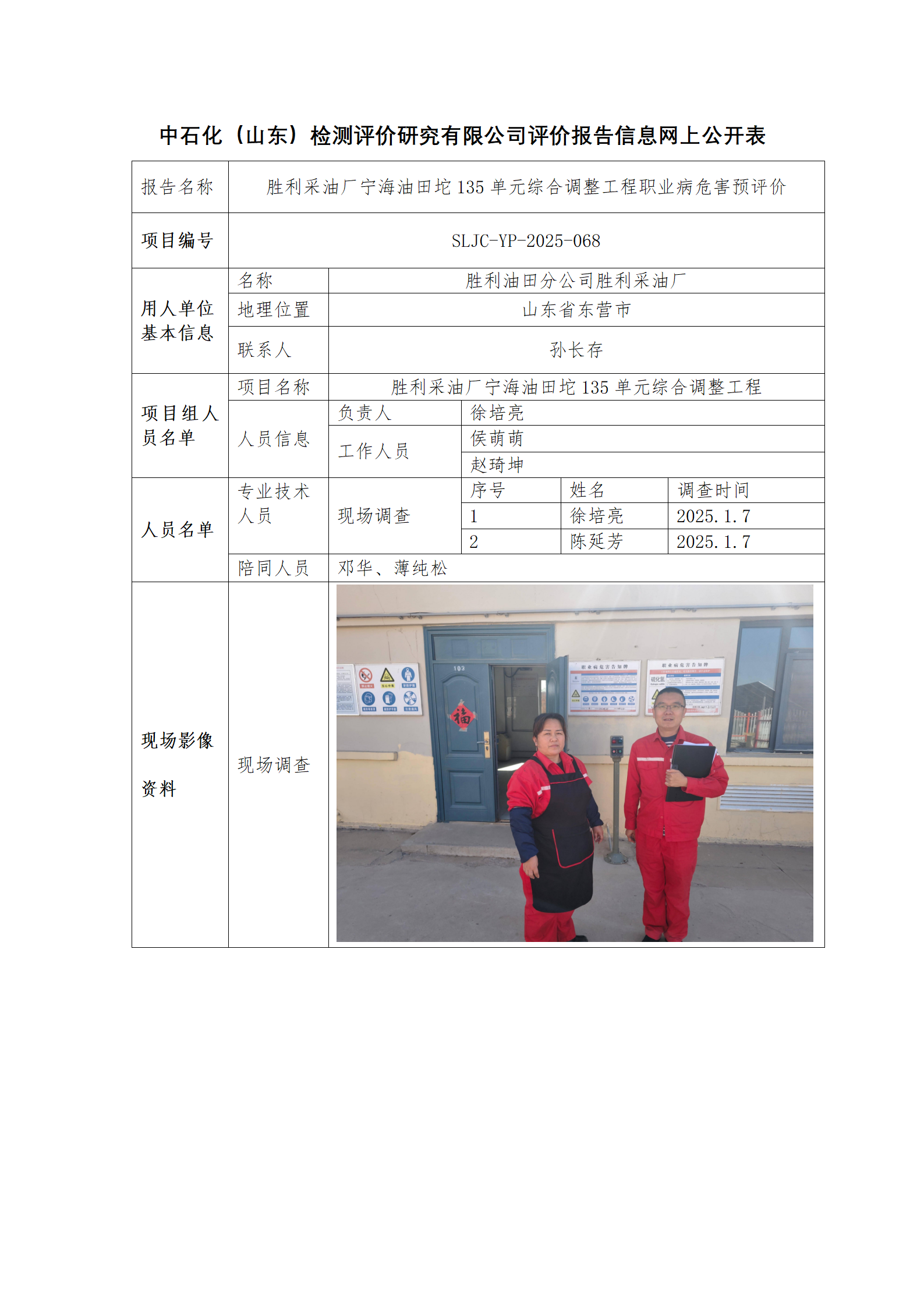 胜利采油厂宁海油田坨135单元综合调整工程职业病危害预评价