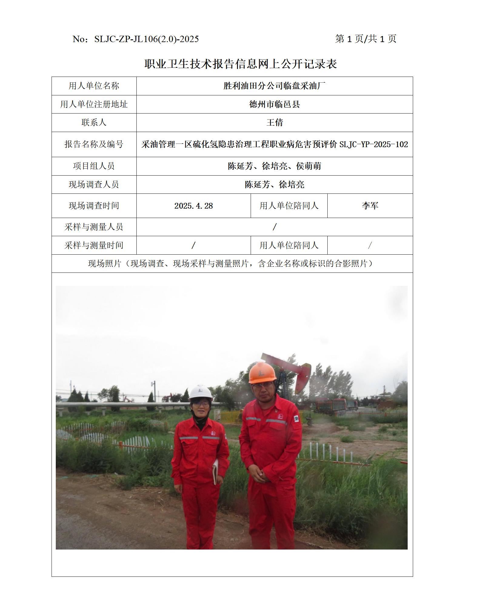 采油管理一区硫化氢隐患治理工程职业病危害预评价SLJC-YP-2025-102