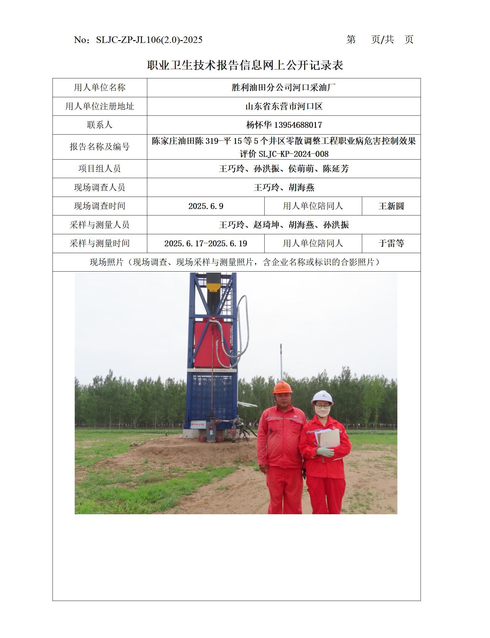 陈家庄油田陈319-平15等5个井区零散调整工程职业病危害控制效果评价SLJC-KP-2024-008