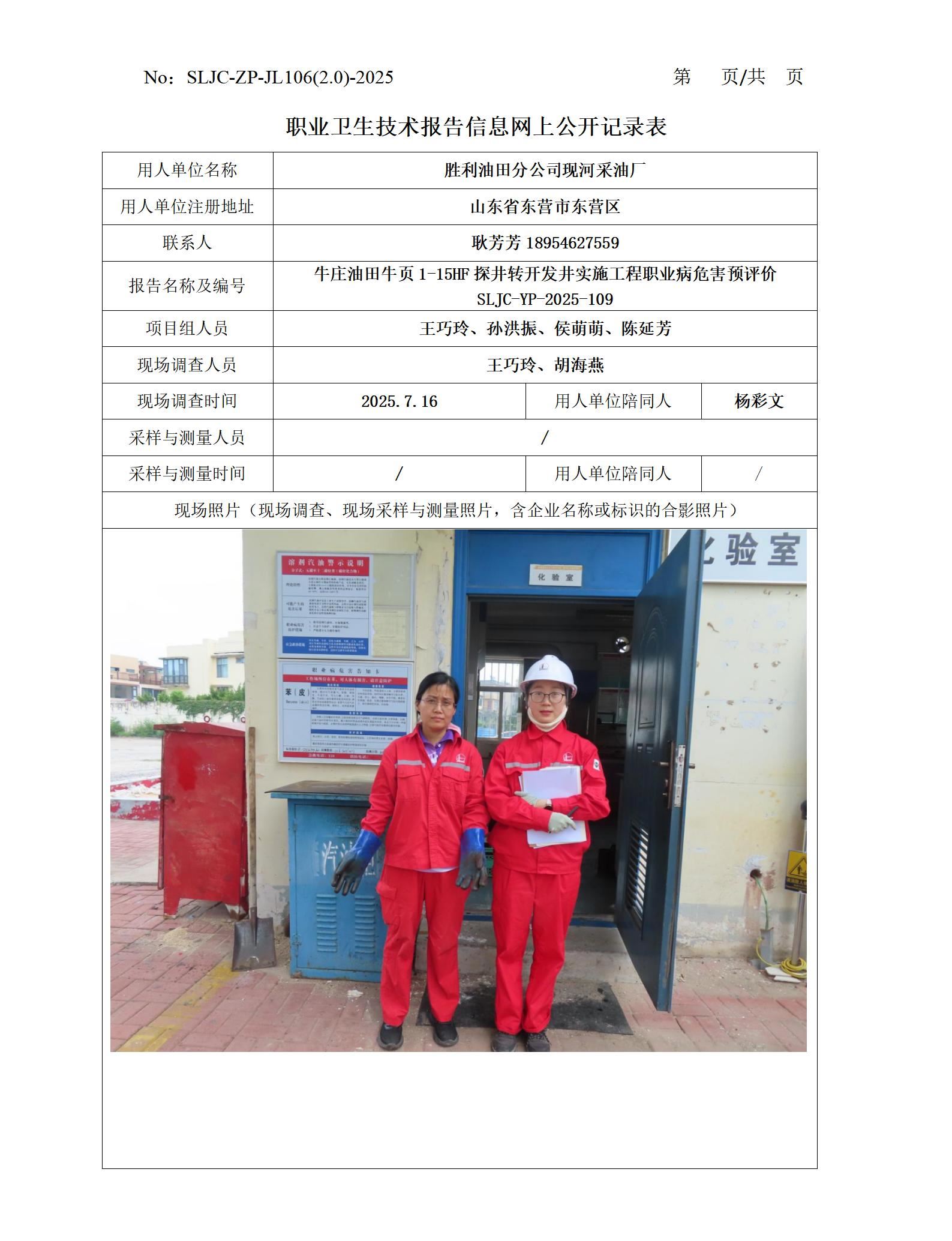 牛庄油田牛页1-15HF探井转开发井实施工程职业病危害预评价SLJC-YP-2025-109