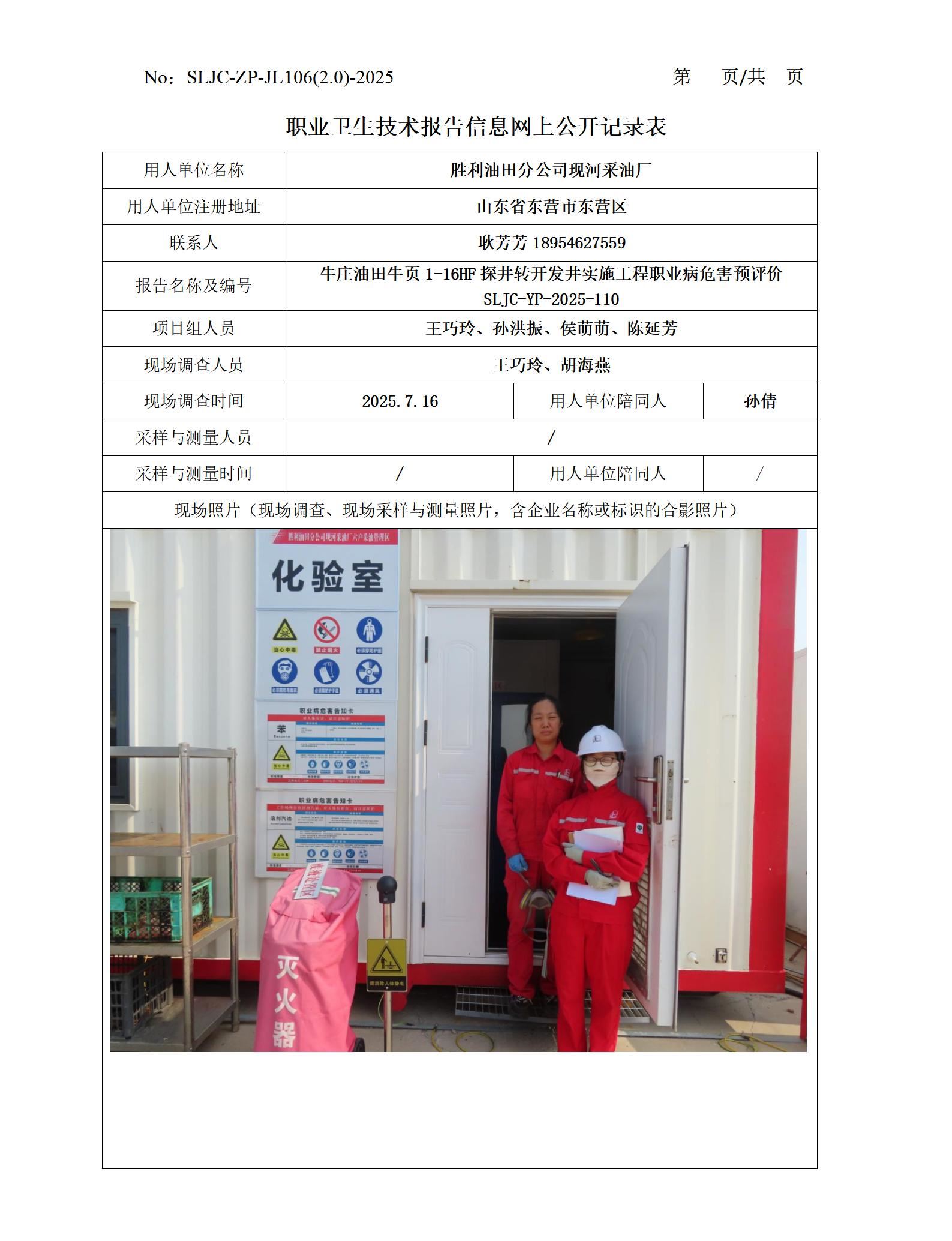 牛庄油田牛页1-16HF探井转开发井实施工程职业病危害预评价SLJC-YP-2025-110