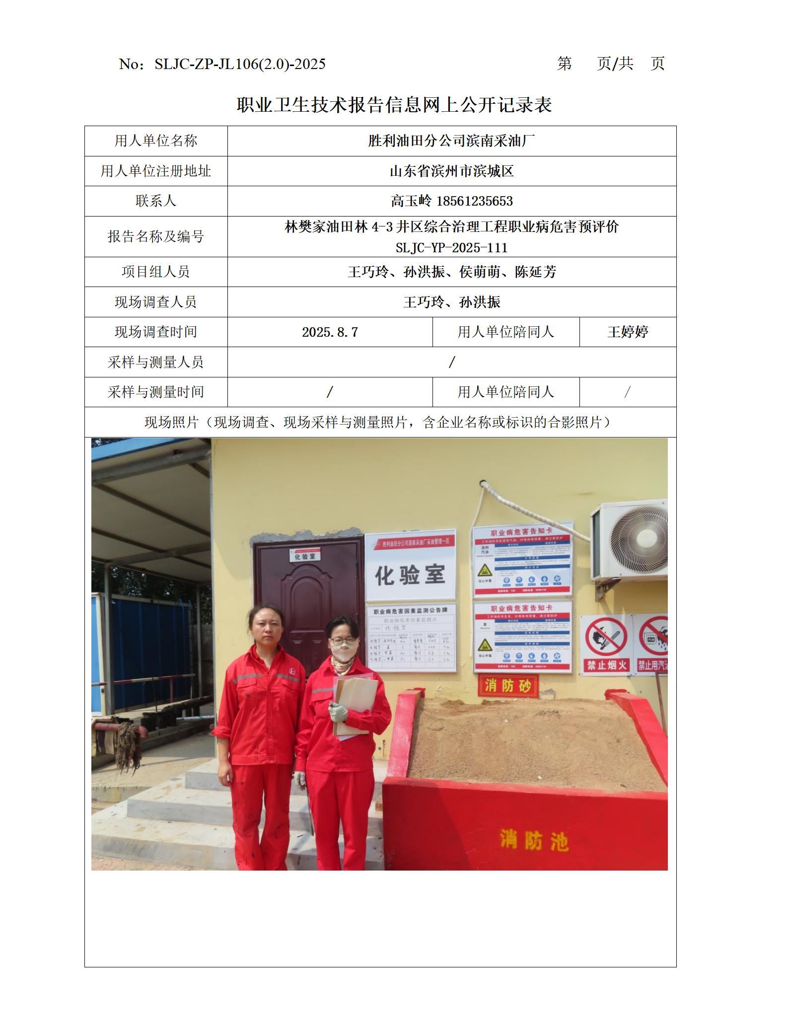 林樊家油田林4-3井区综合治理工程职业病危害预评价SLJC-YP-2025-111