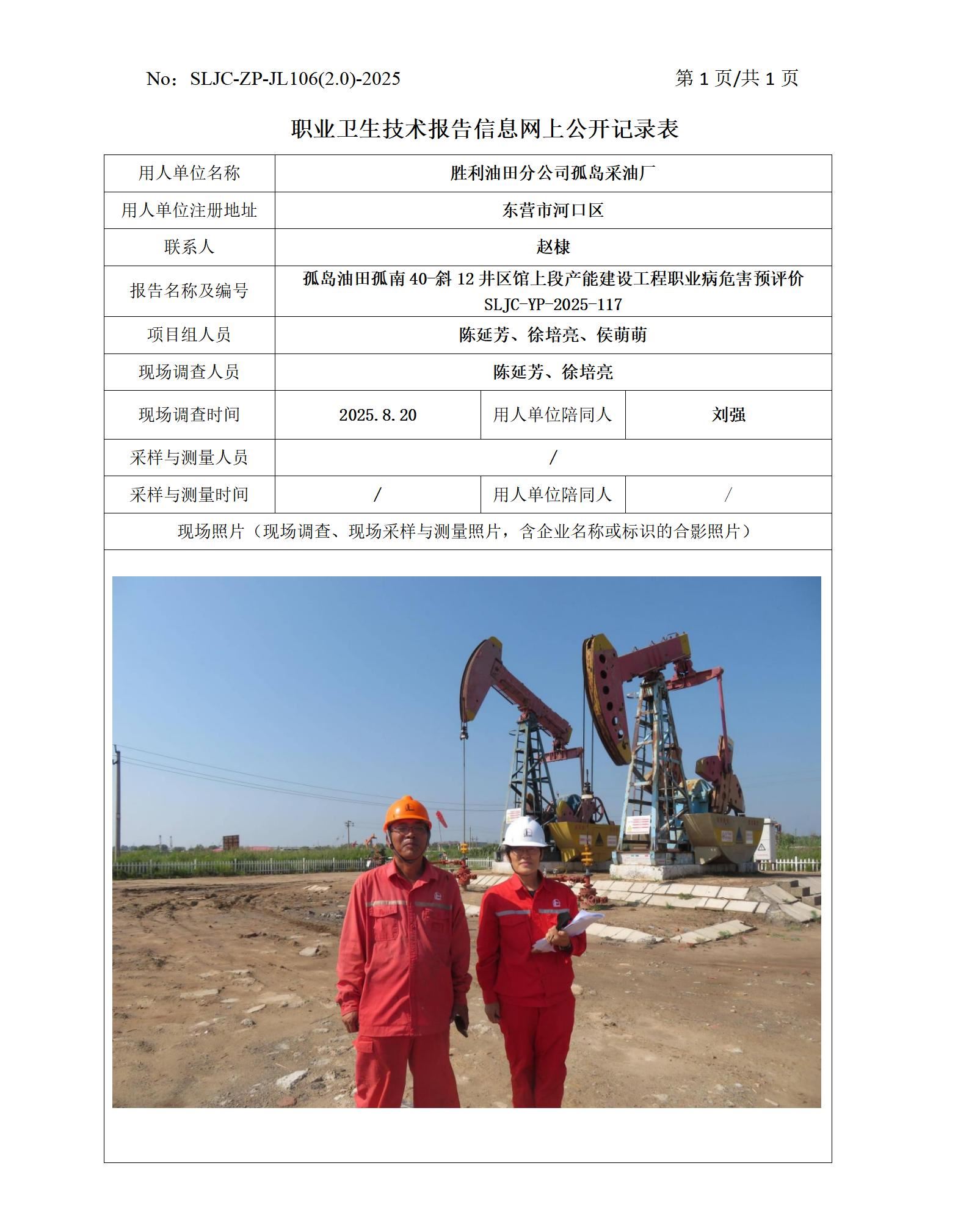 孤岛油田孤南40-斜12井区馆上段产能建设工程职业病危害预评价SLJC-YP-2025-117