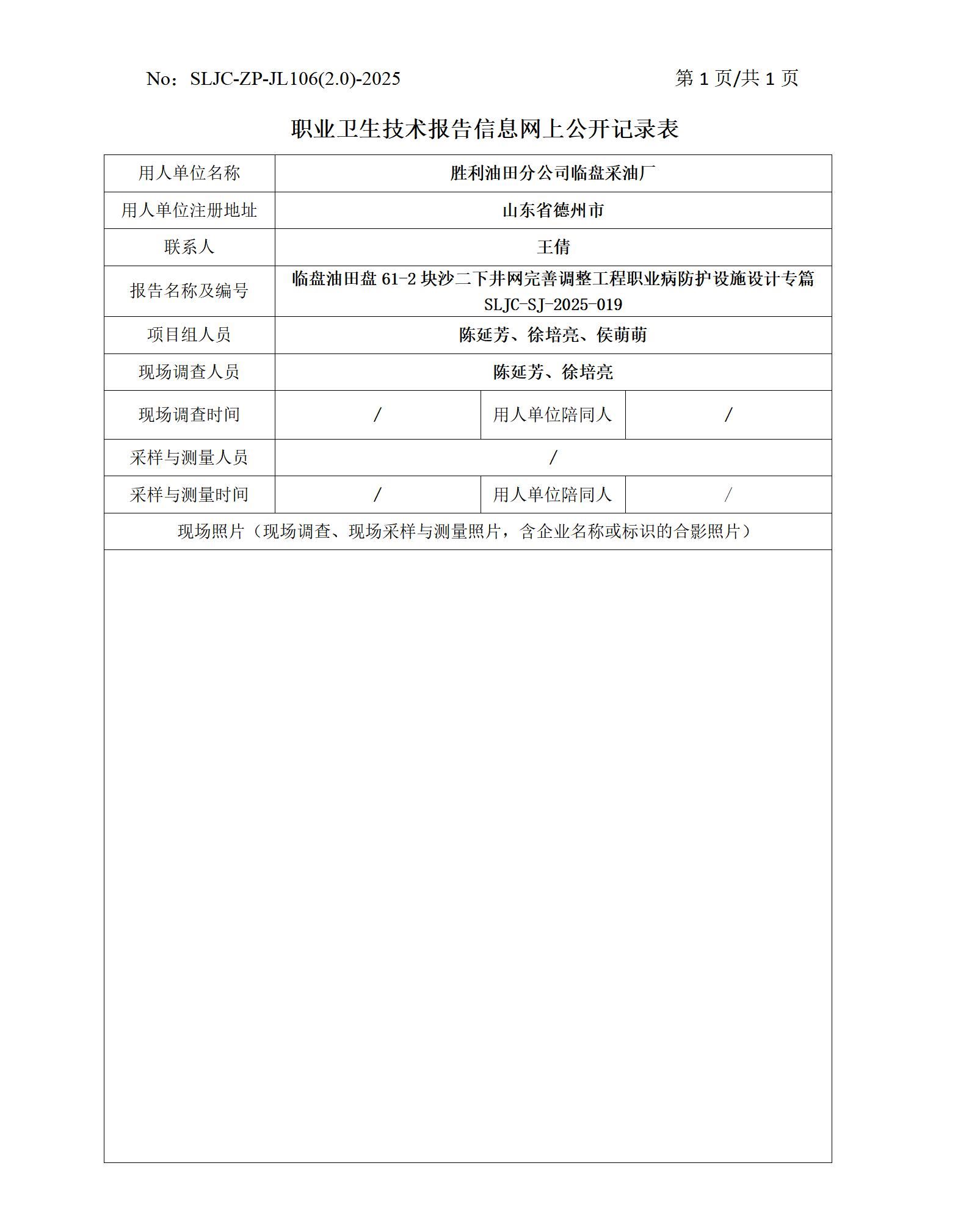 临盘油田盘61-2块沙二下井网完善调整工程职业病防护设施设计专篇SLJC-SJ-2025-019