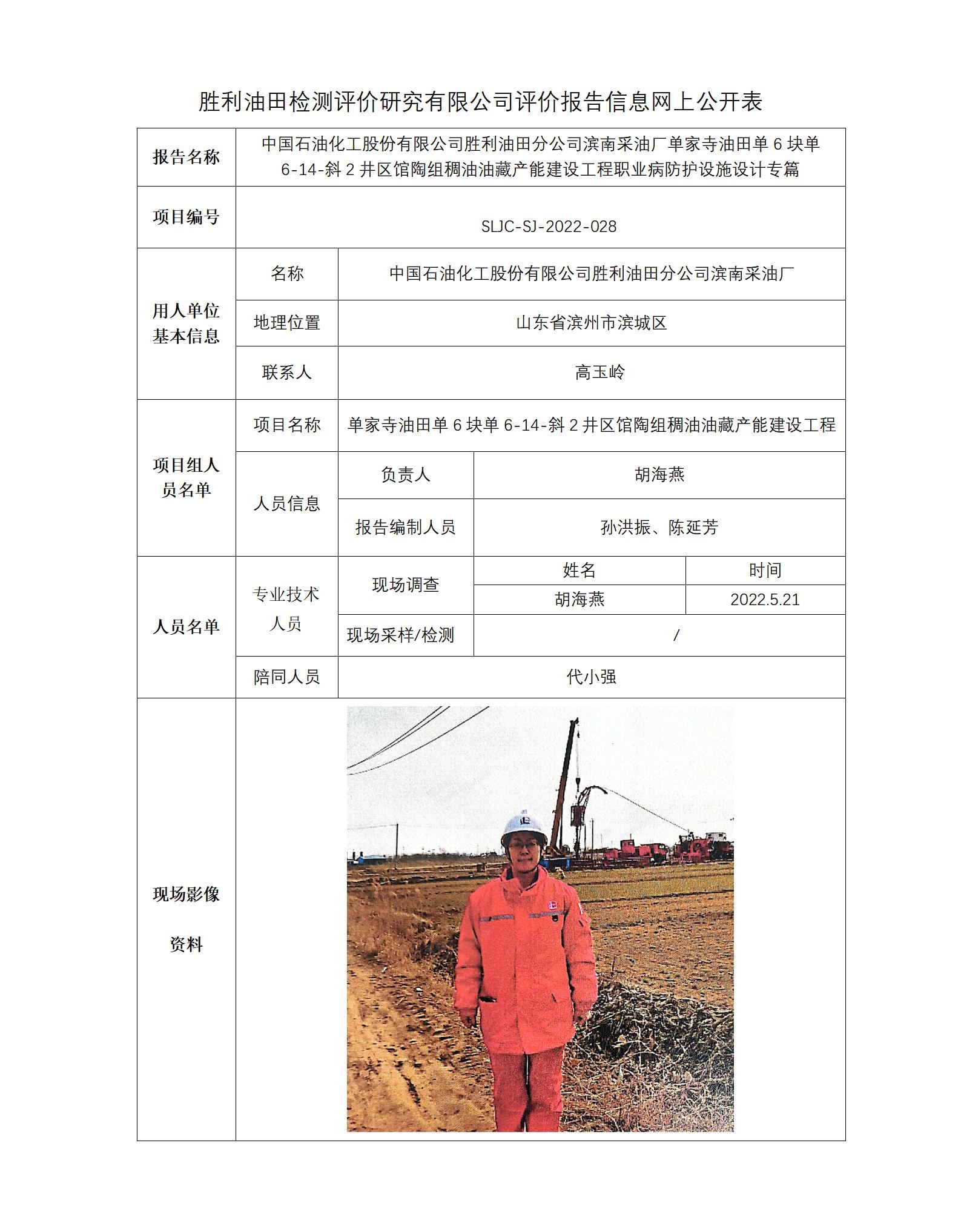 中国石油化工股份有限公司胜利油田分公司滨南采油厂单家寺油田单6块单6-14-斜2井区馆陶组稠油油藏产能建设工程职业病防护设施设计专篇