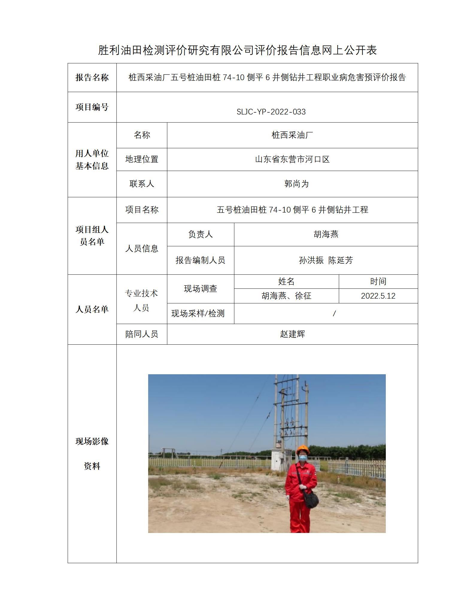 桩西采油厂五号桩油田桩74-10侧平6井侧钻井工程职业病危害预评价报告