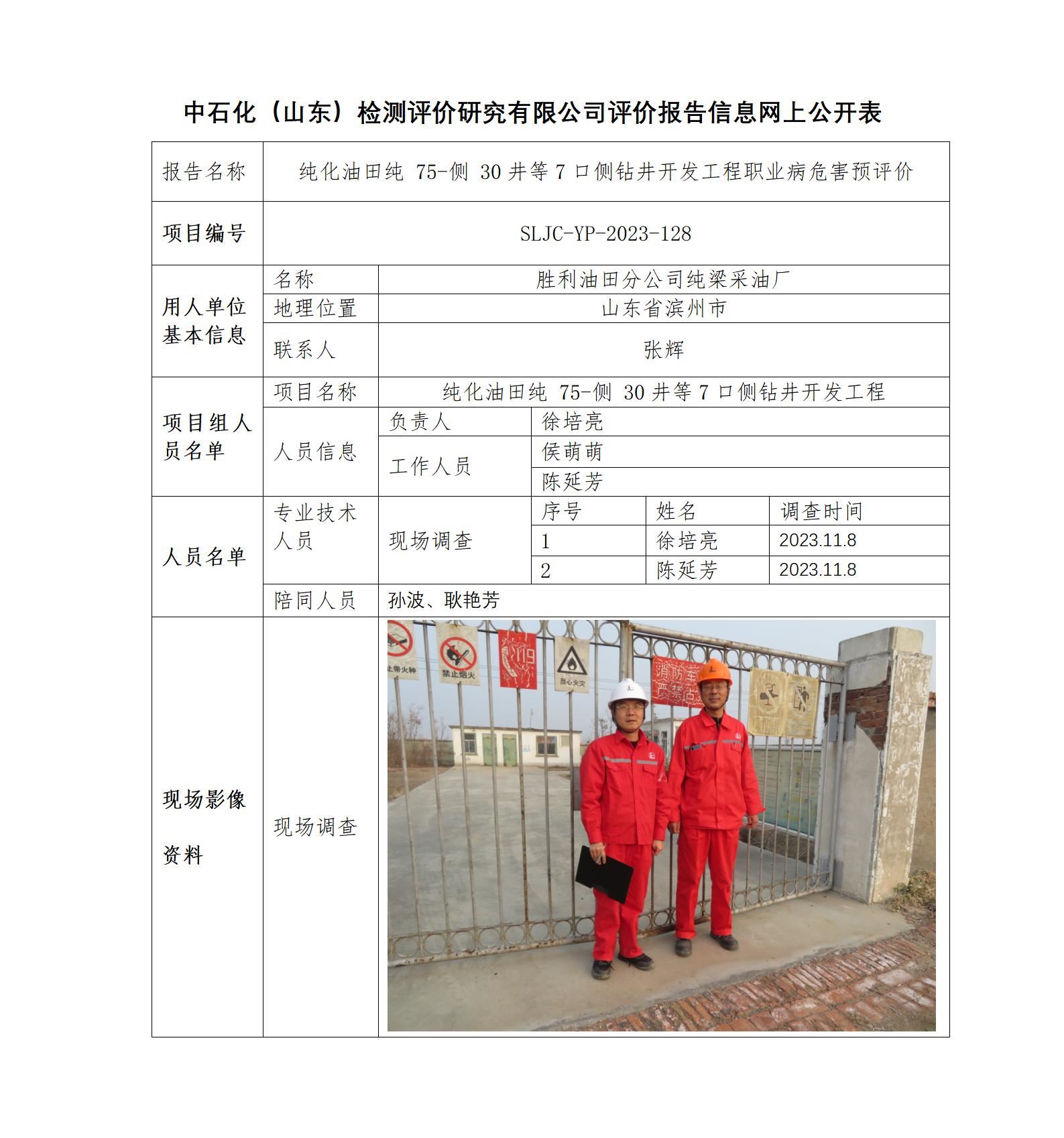 纯化油田纯 75-侧 30井等7口侧钻井开发工程职业病危害预评价