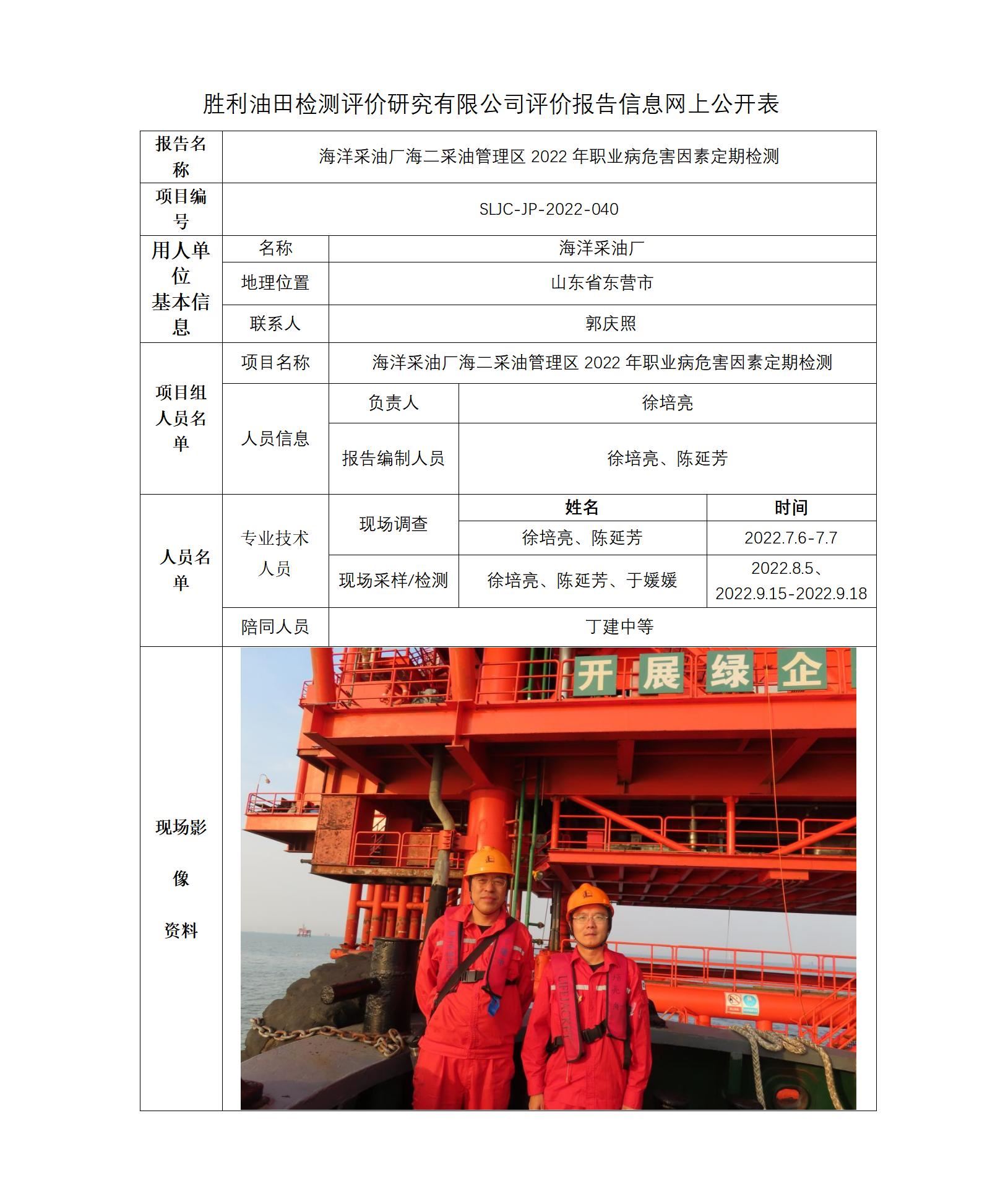 海洋采油厂海二采油管理区2022年职业病危害因素定期检测