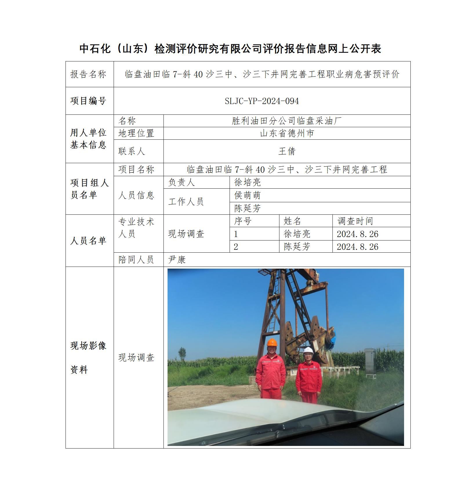 临盘油田临7-斜40沙三中、沙三下井网完善工程职业病危害预评价