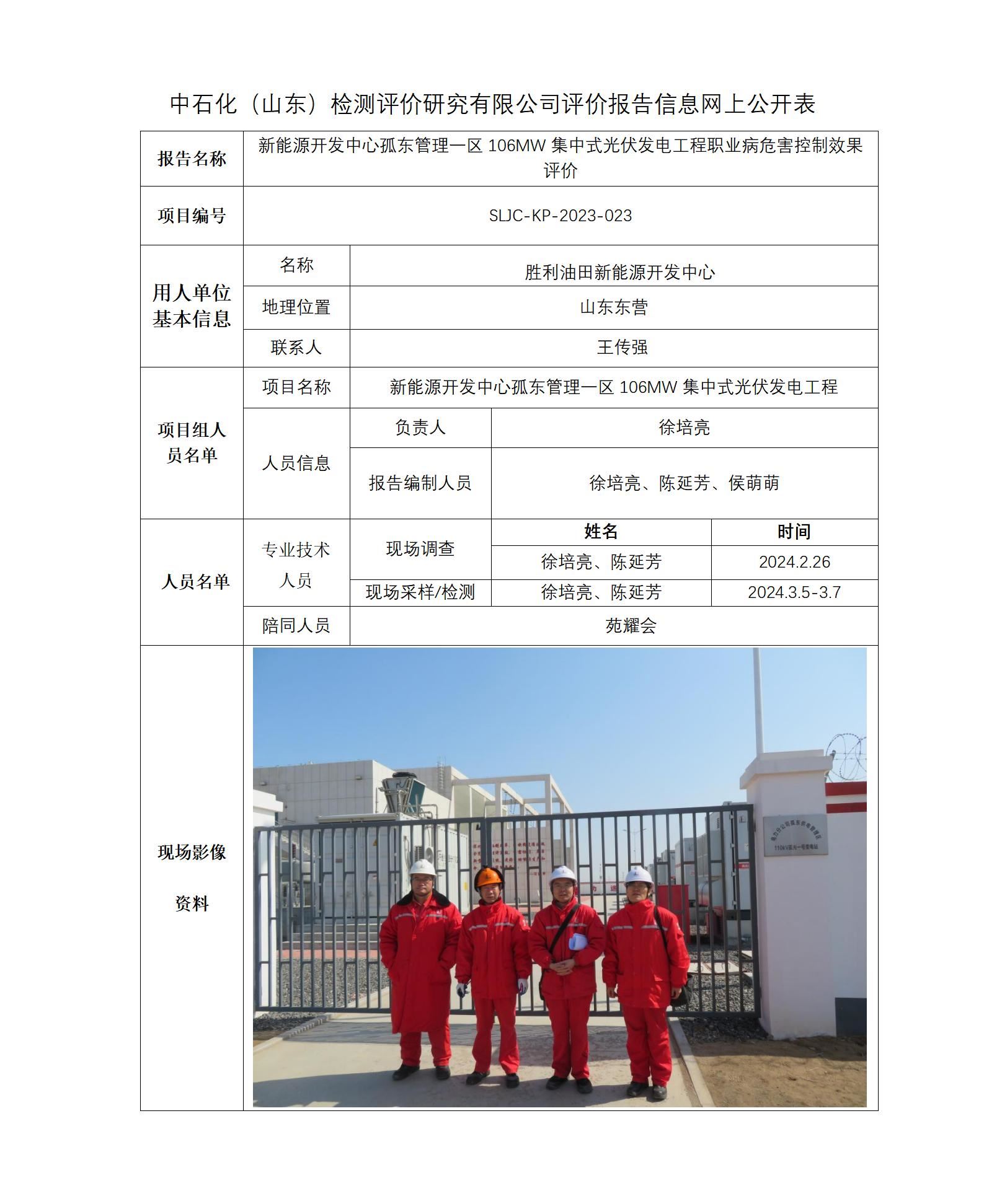 新能源开发中心孤东管理一区106MW集中式光伏发电工程职业病危害控制效果评价