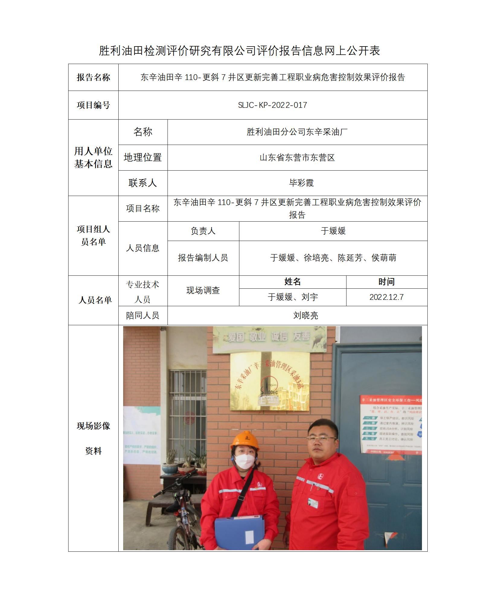 东辛油田辛110-更斜7井区更新完善工程职业病危害控制效果评价报告