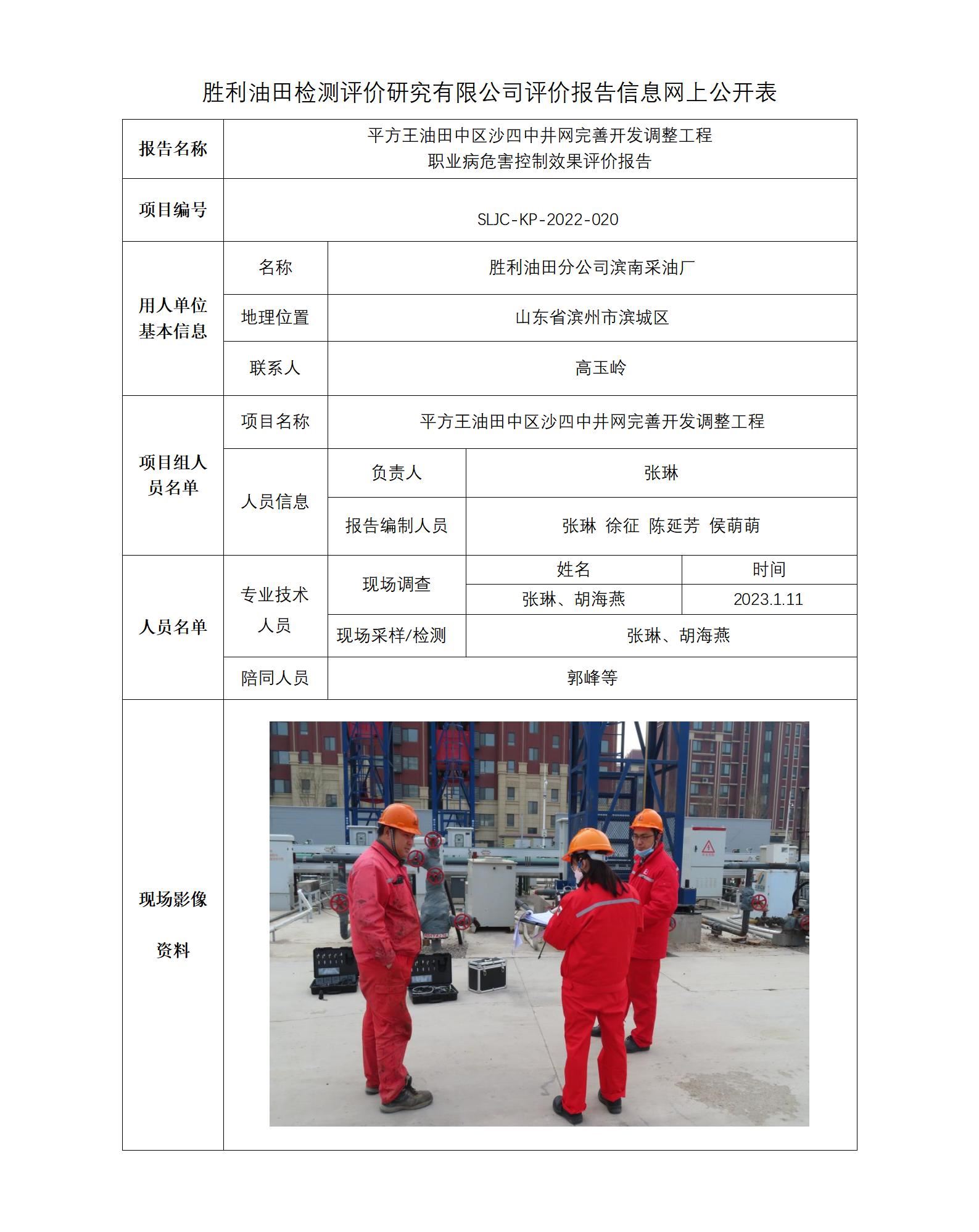 平方王油田中区沙四中井网完善开发调整工程职业病危害控制效果评价报告