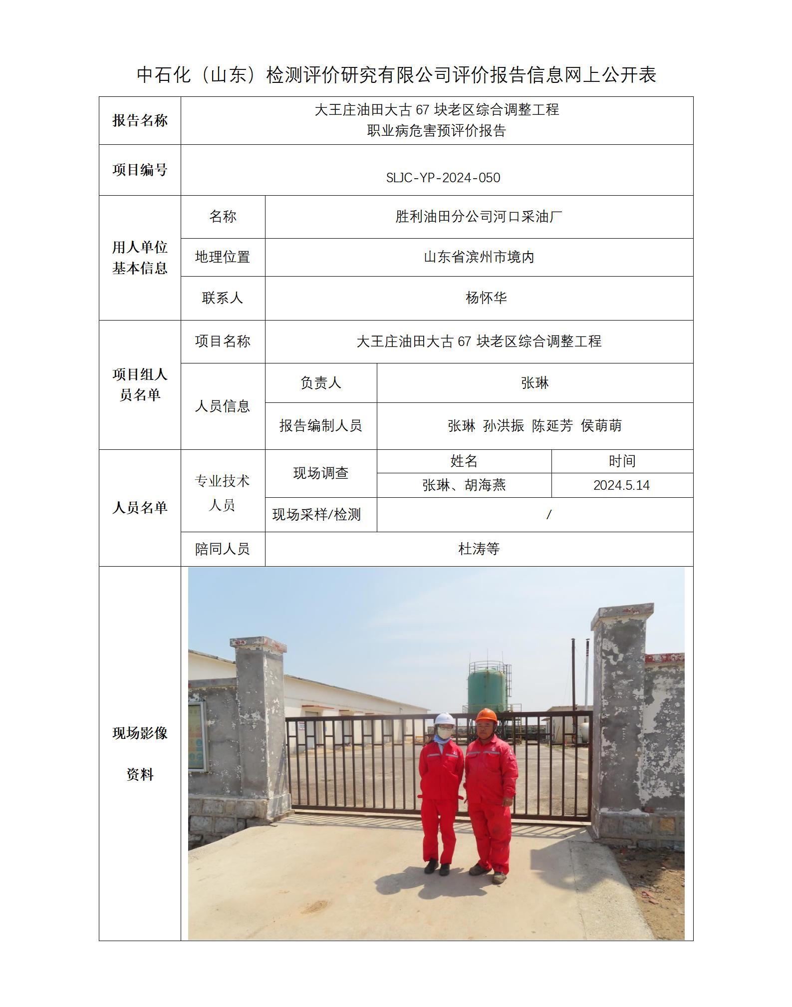 大王庄油田大古67块老区综合调整工程 职业病危害预评价报告