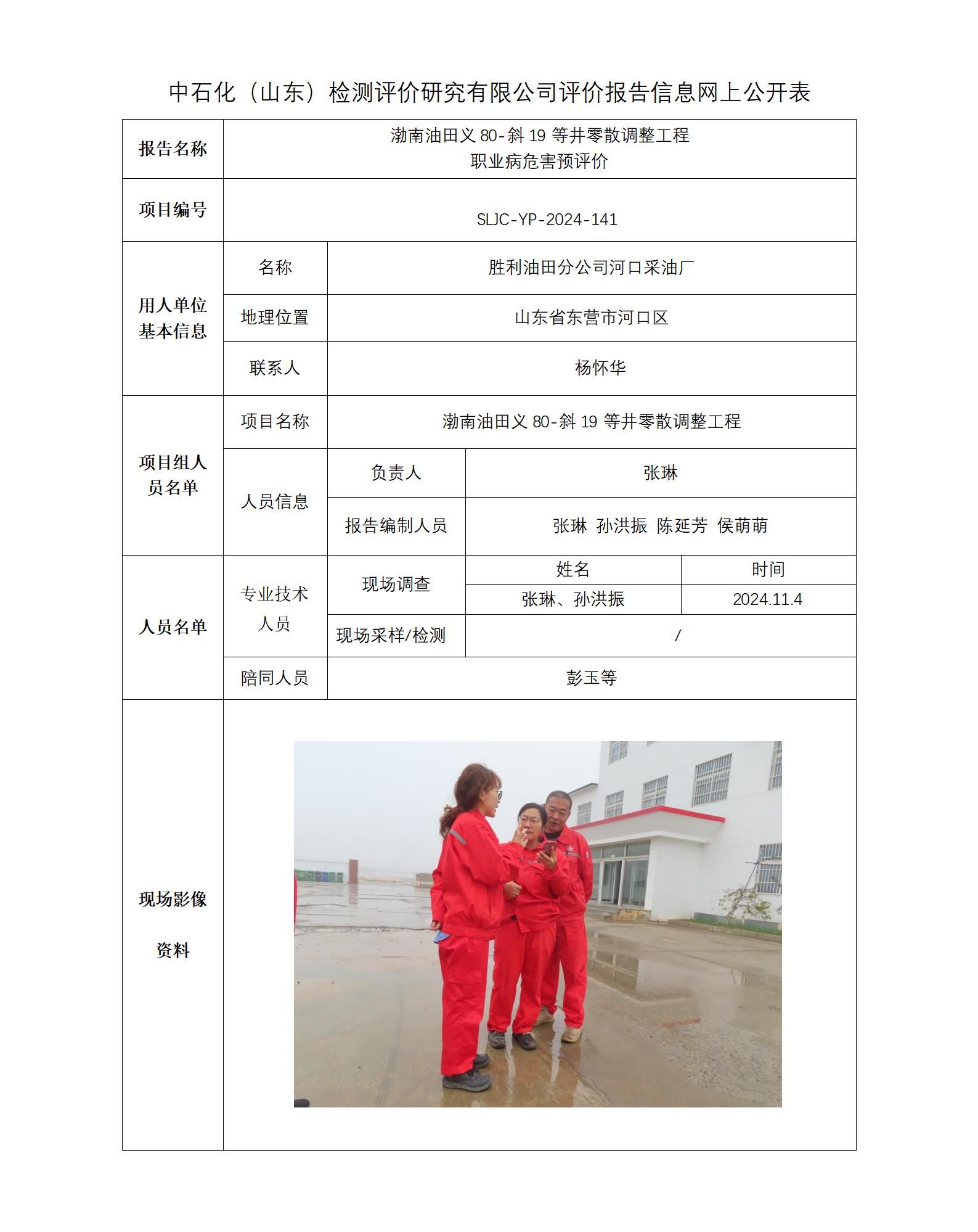 渤南油田义80-斜19等井零散调整工程 职业病危害预评价