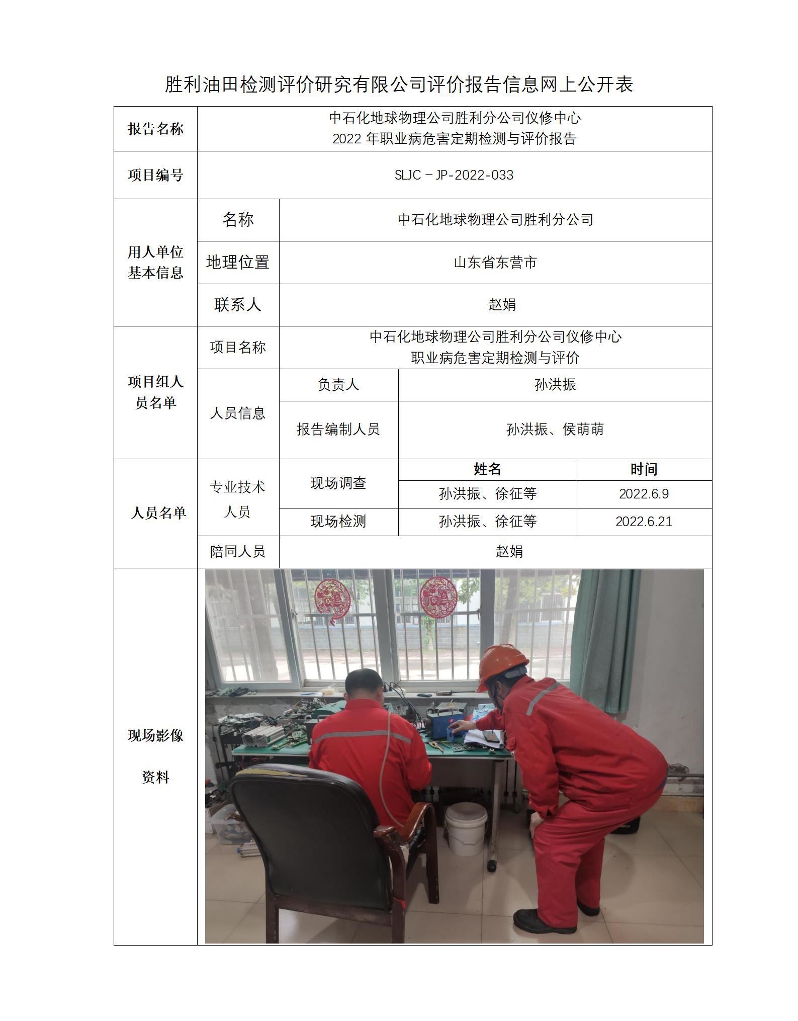 中石化地球物理公司胜利分公司仪修中心 2022年职业病危害定期检测与评价报告