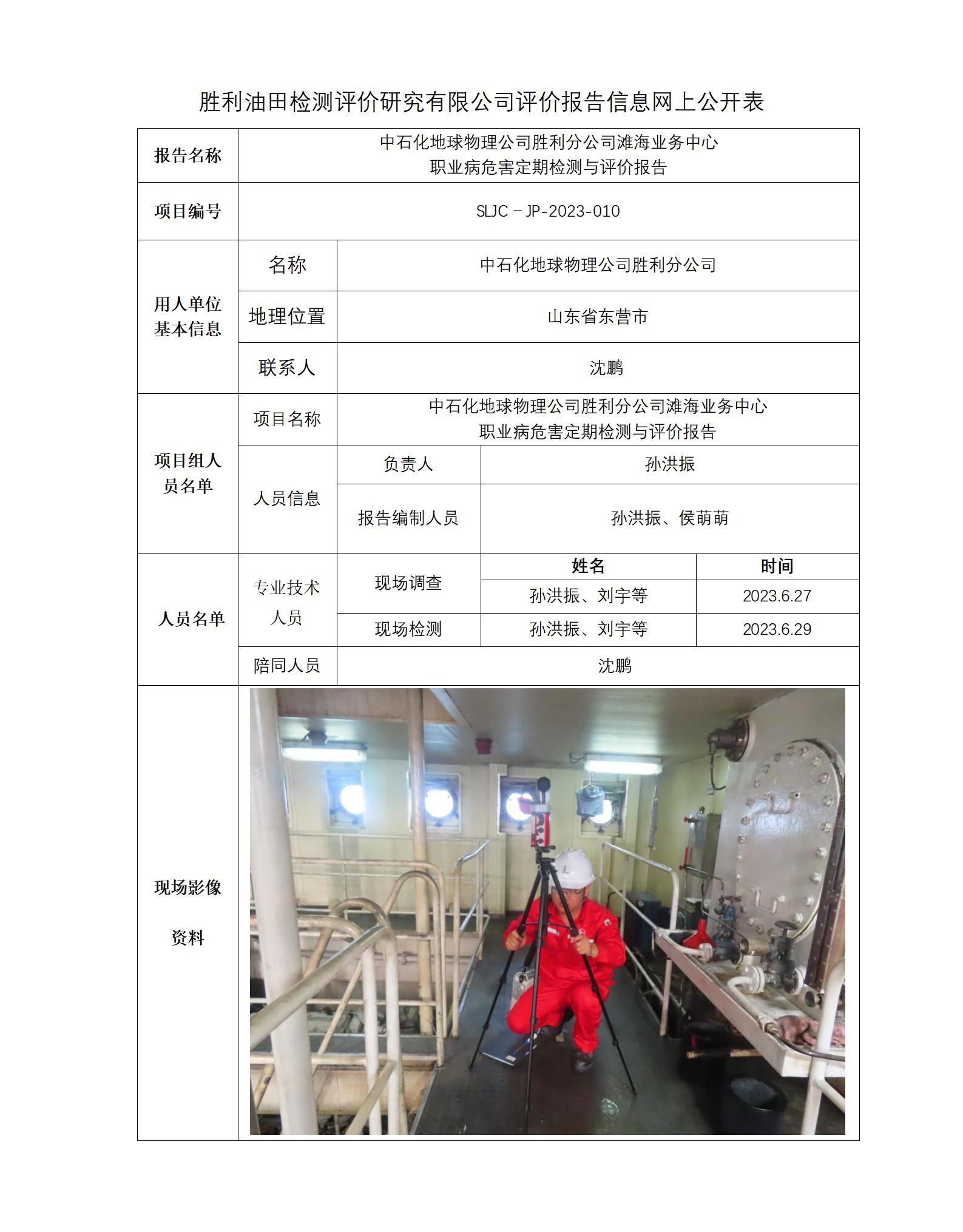 中石化地球物理公司胜利分公司滩海业务中心 职业病危害定期检测与评价报告