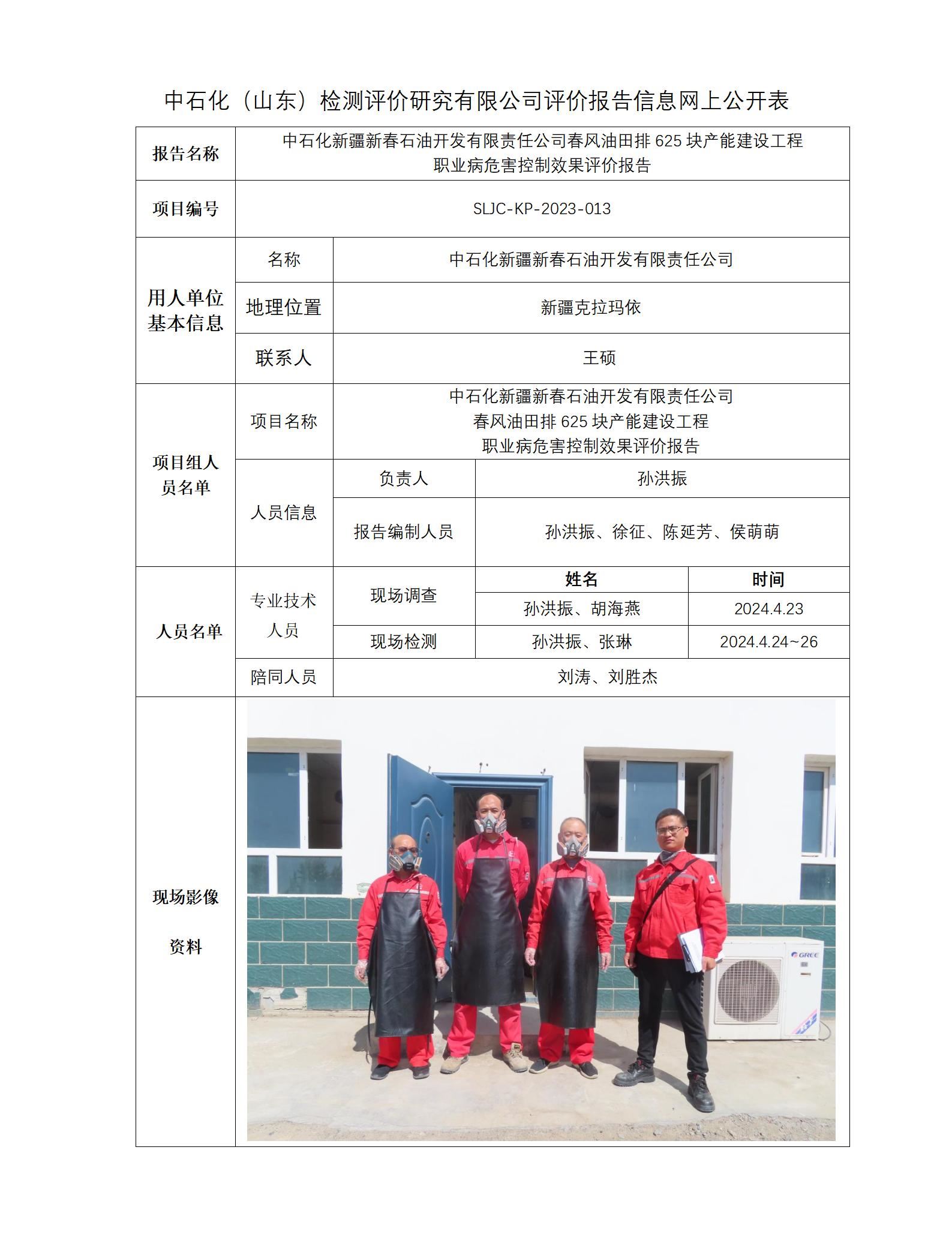 中石化新疆新春石油开发有限责任公司春风油田排625块产能建设工程 职业病危害控制效果评价报告