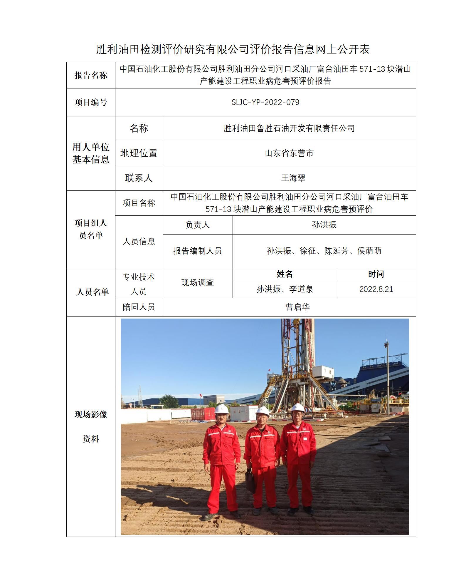 中国石油化工股份有限公司胜利油田分公司河口采油厂富台油田车571-13块潜山产能建设工程职业病危害预评价报告