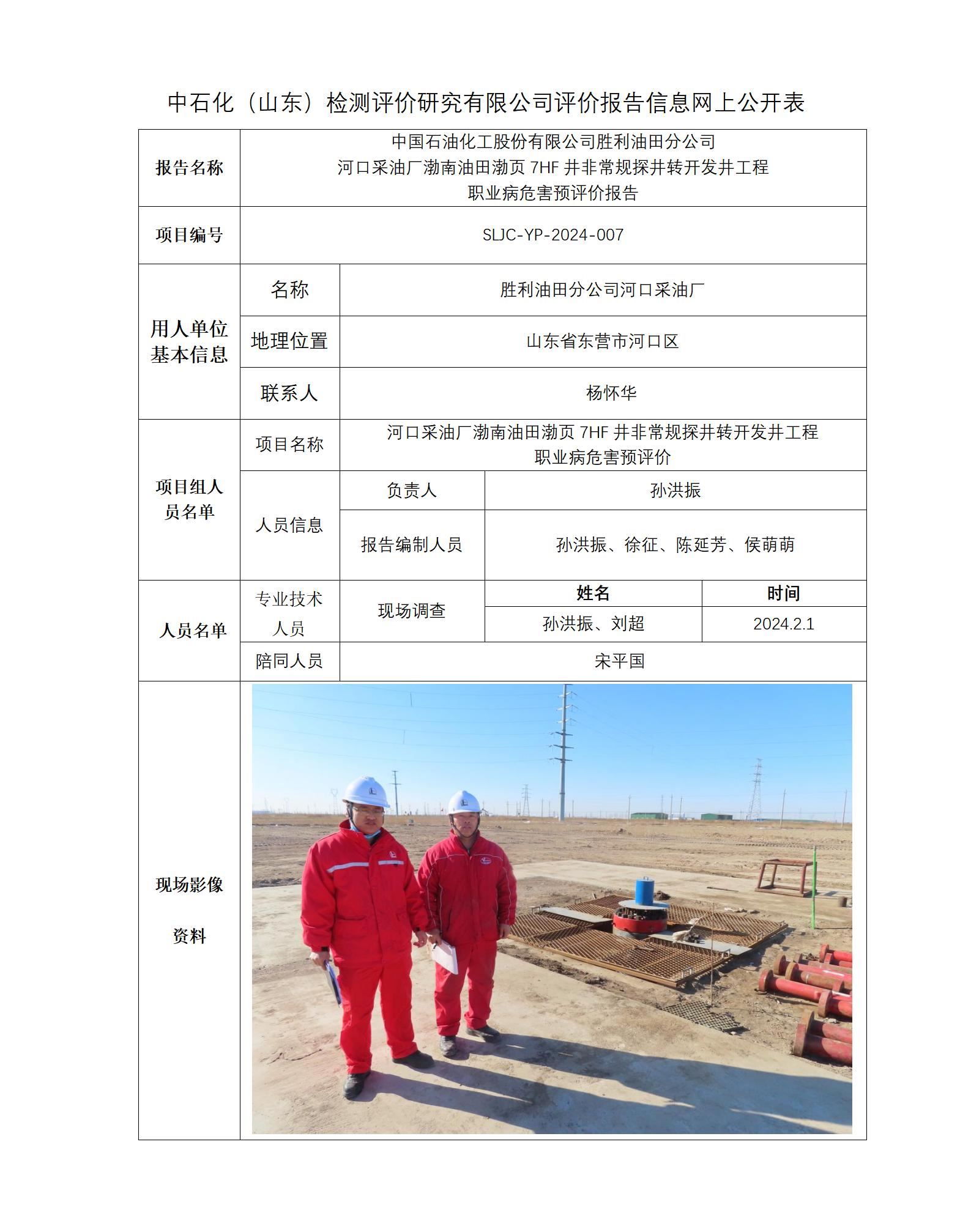 中国石油化工股份有限公司胜利油田分公司 河口采油厂渤南油田渤页7HF井非常规探井转开发井工程 职业病危害预评价报告