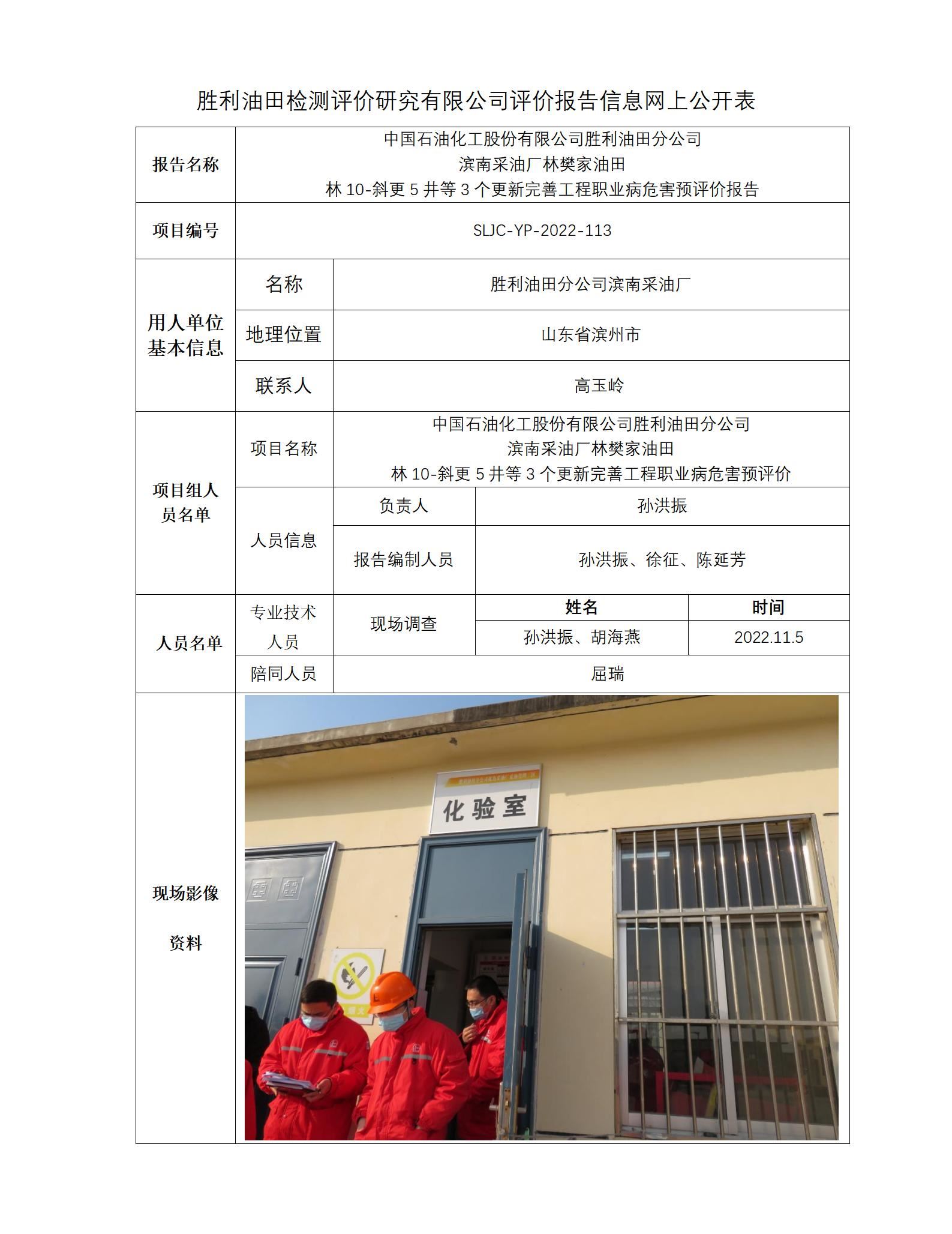 中国石油化工股份有限公司胜利油田分公司 滨南采油厂林樊家油田 林10-斜更5井等3个更新完善工程职业病危害预评价报告