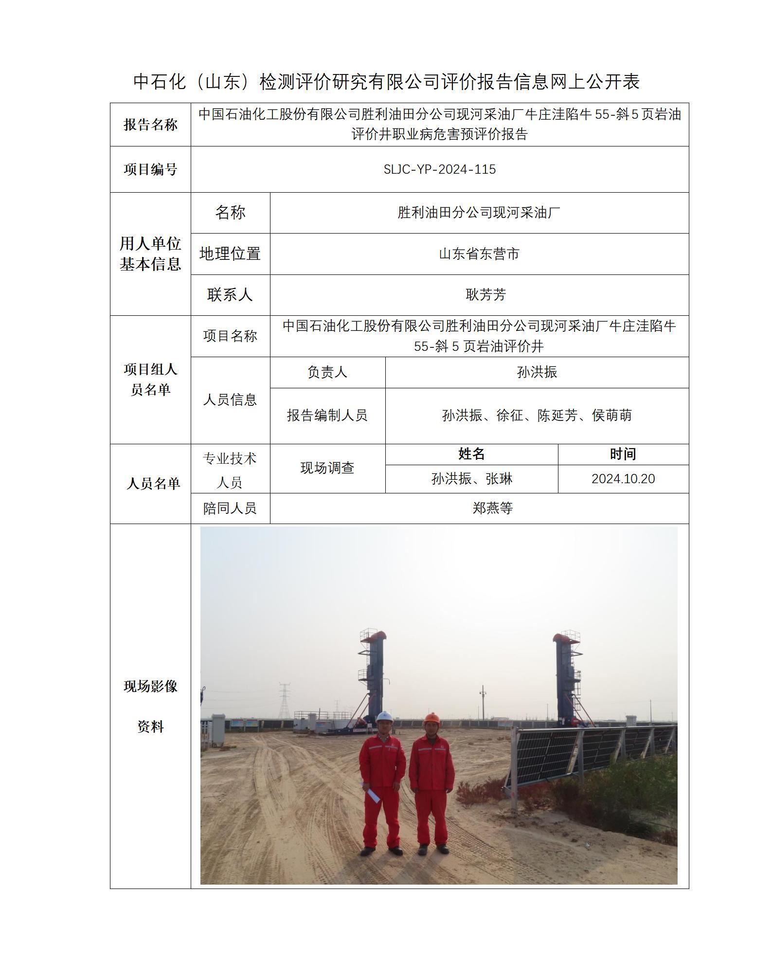 中国石油化工股份有限公司胜利油田分公司现河采油厂牛庄洼陷牛55-斜5页岩油评价井职业病危害预评价报告
