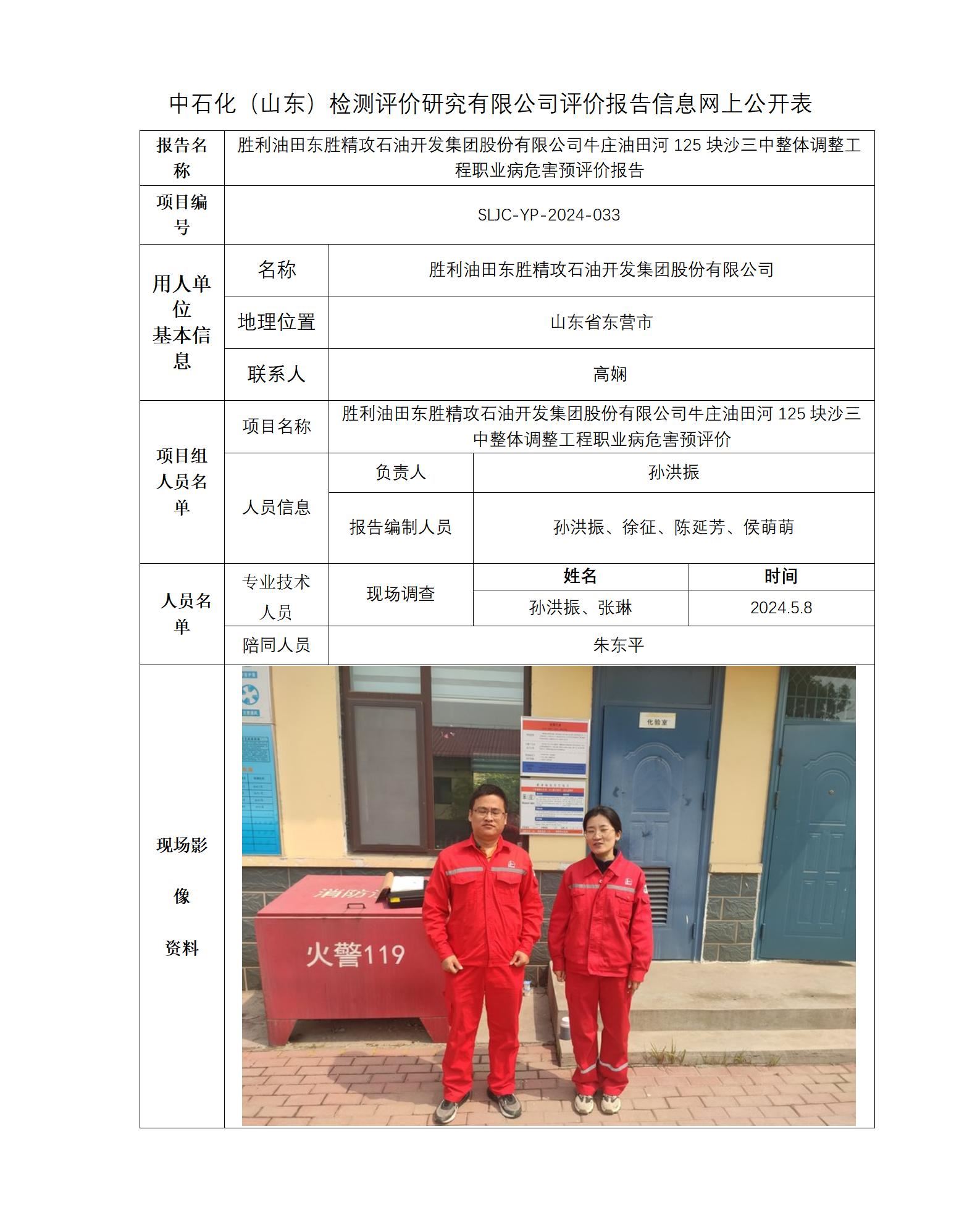 胜利油田东胜精攻石油开发集团股份有限公司牛庄油田河125块沙三中整体调整工程职业病危害预评价报告