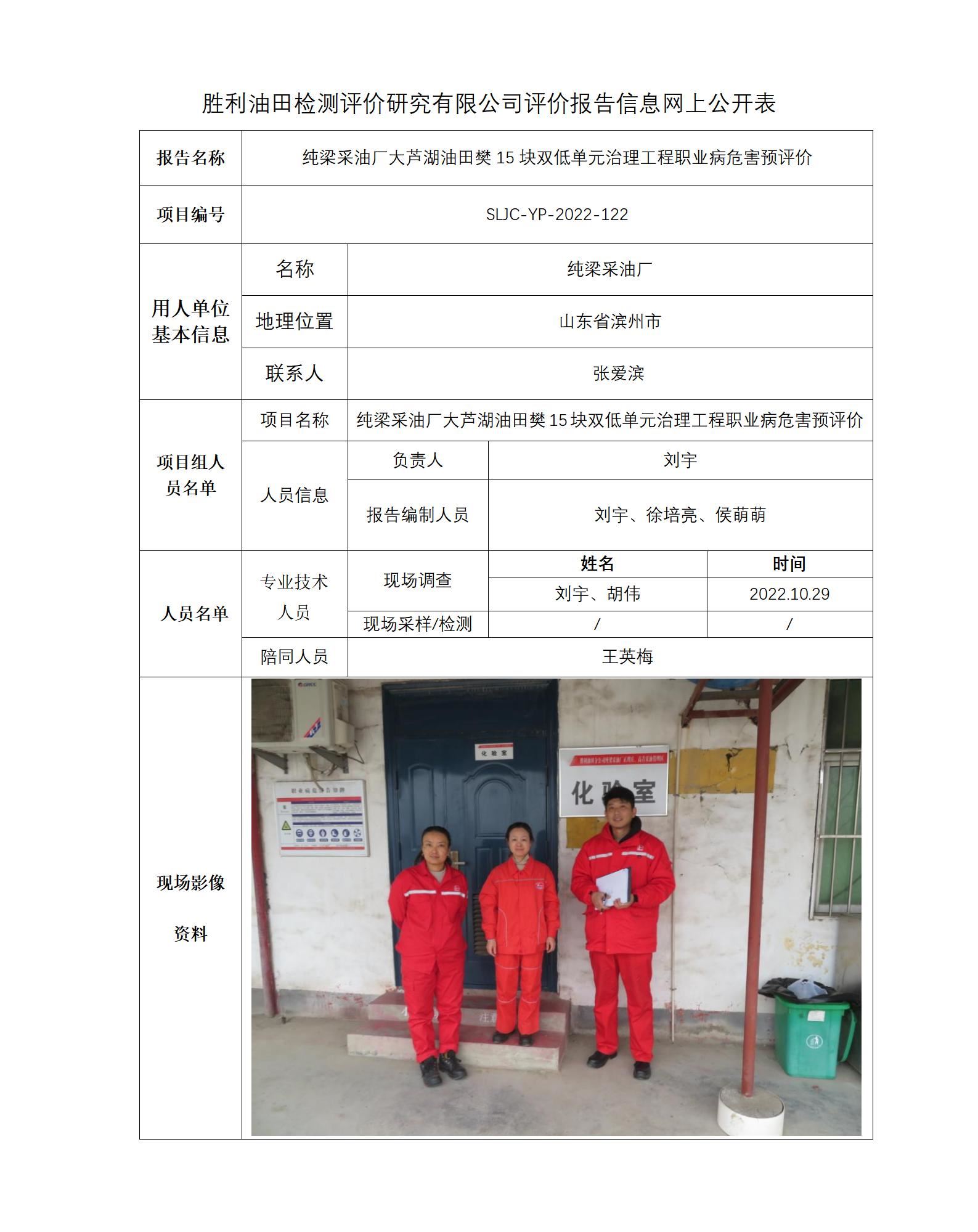 纯梁采油厂大芦湖油田樊15块双低单元治理工程职业病危害预评价