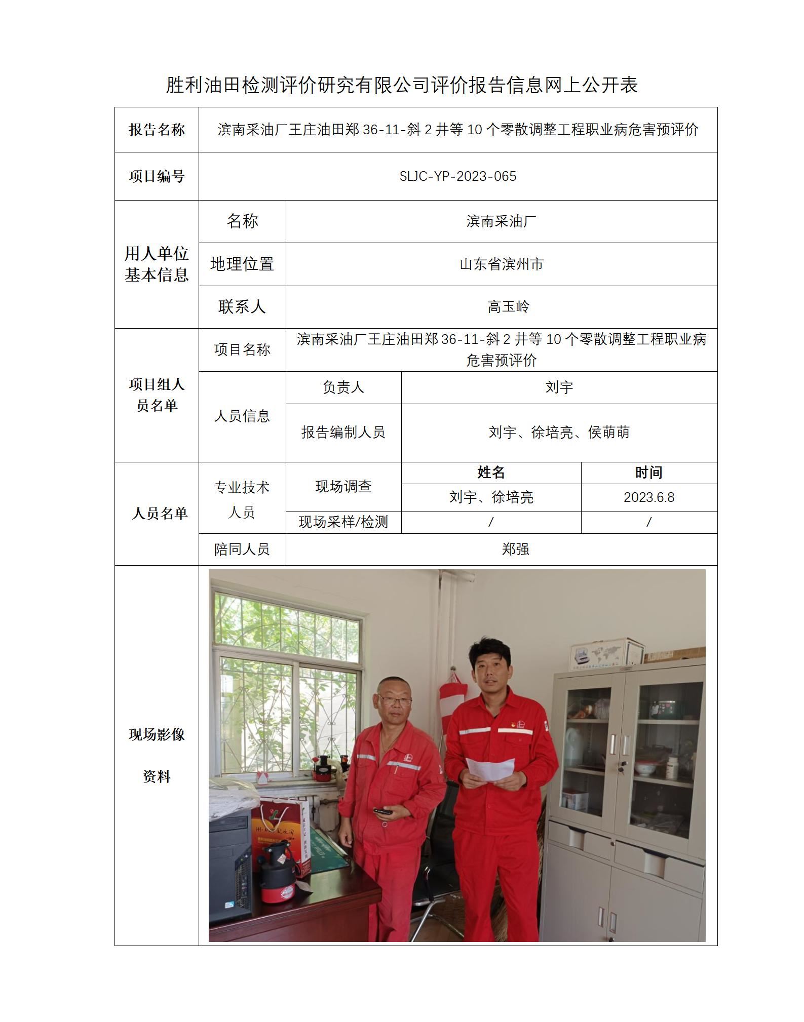 滨南采油厂王庄油田郑36-11-斜2井等10个零散调整工程职业病危害预评价