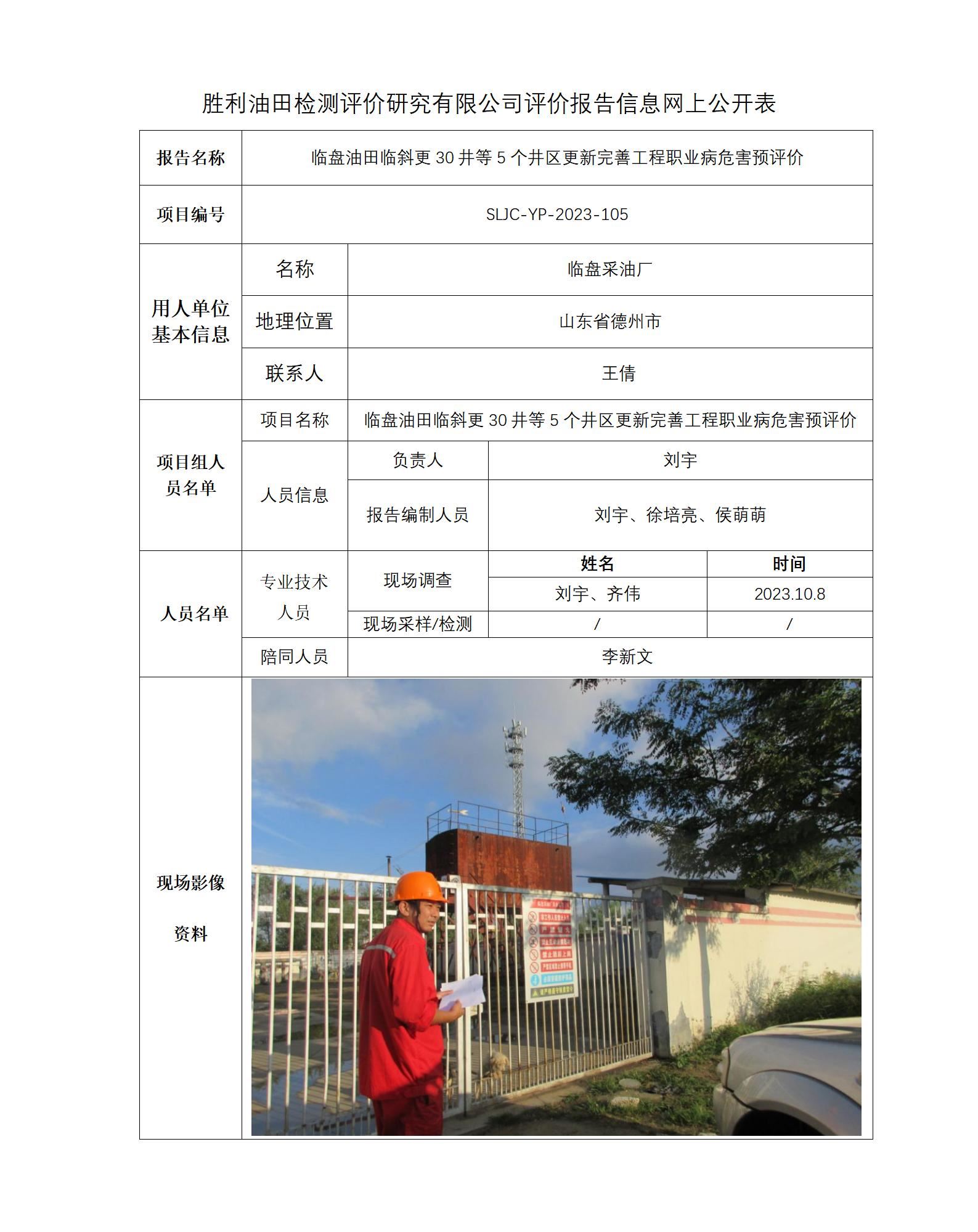 临盘油田临斜更30井等5个井区更新完善工程职业病危害预评价