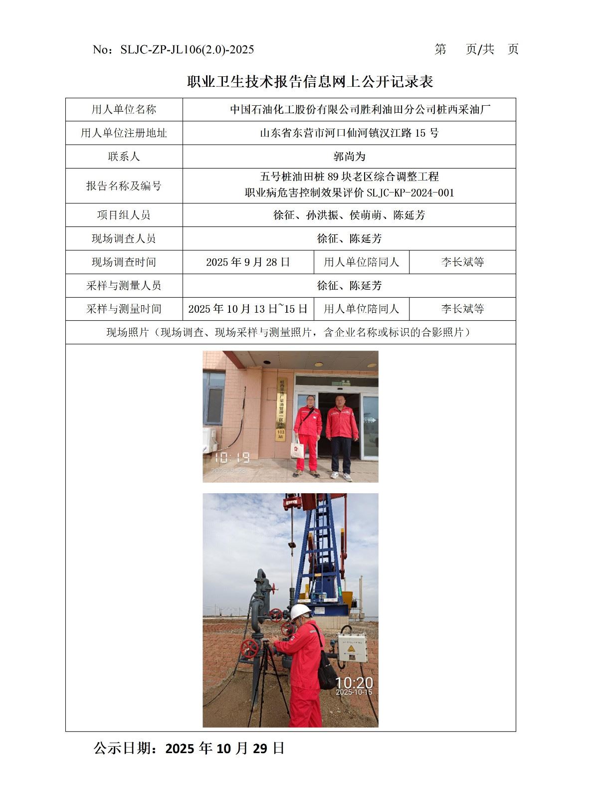 五号桩油田桩89块老区综合调整工程 职业病危害控制效果评价SLJC-KP-2024-001