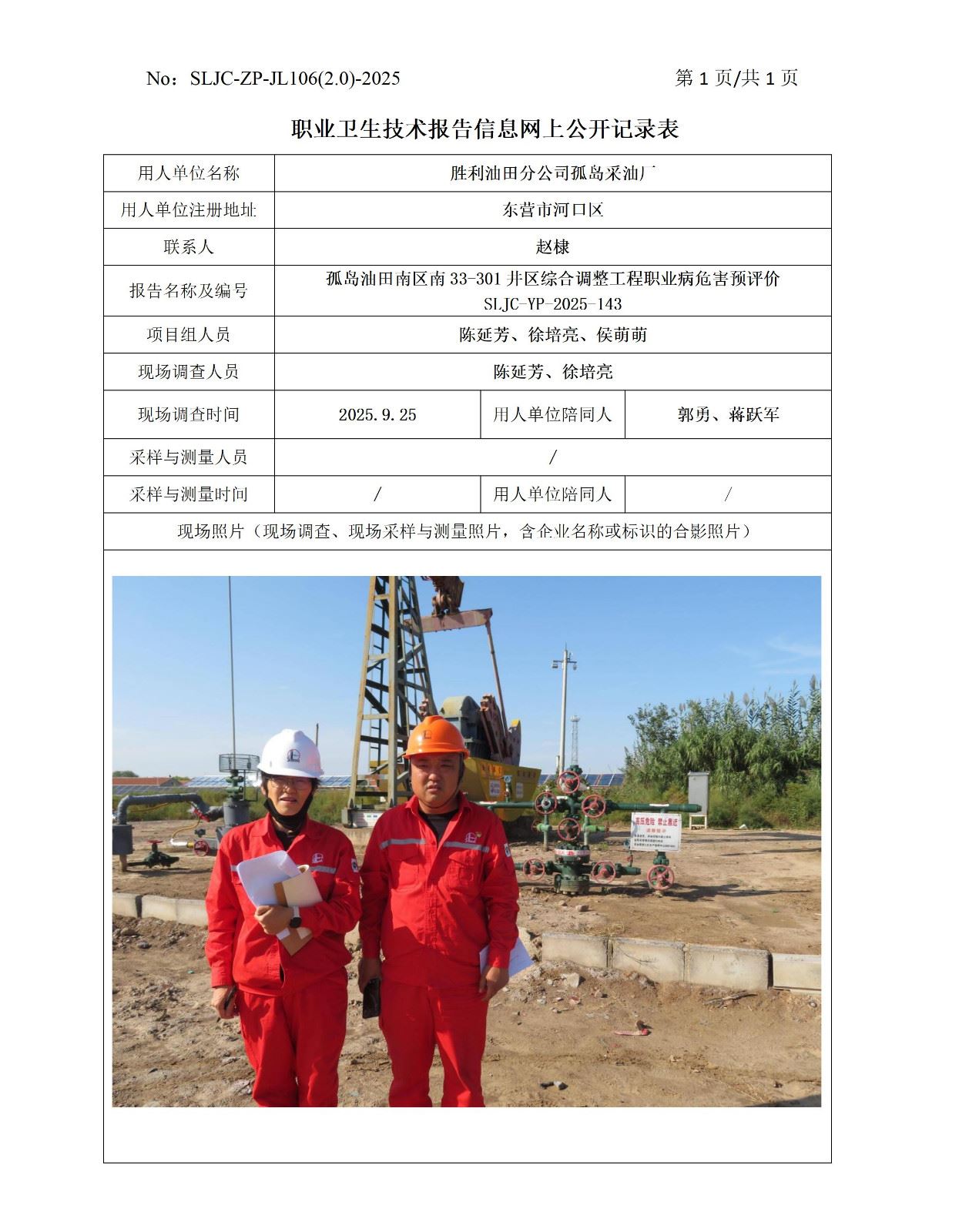 孤岛油田南区南33-301井区综合调整工程职业病危害预评价SLJC-YP-2025-143