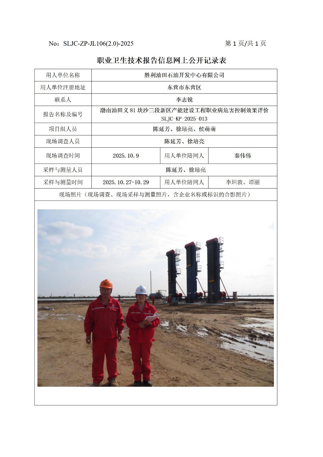 渤南油田义81块沙三段新区产能建设工程职业病危害控制效果评价SLJC-KP-2025-013