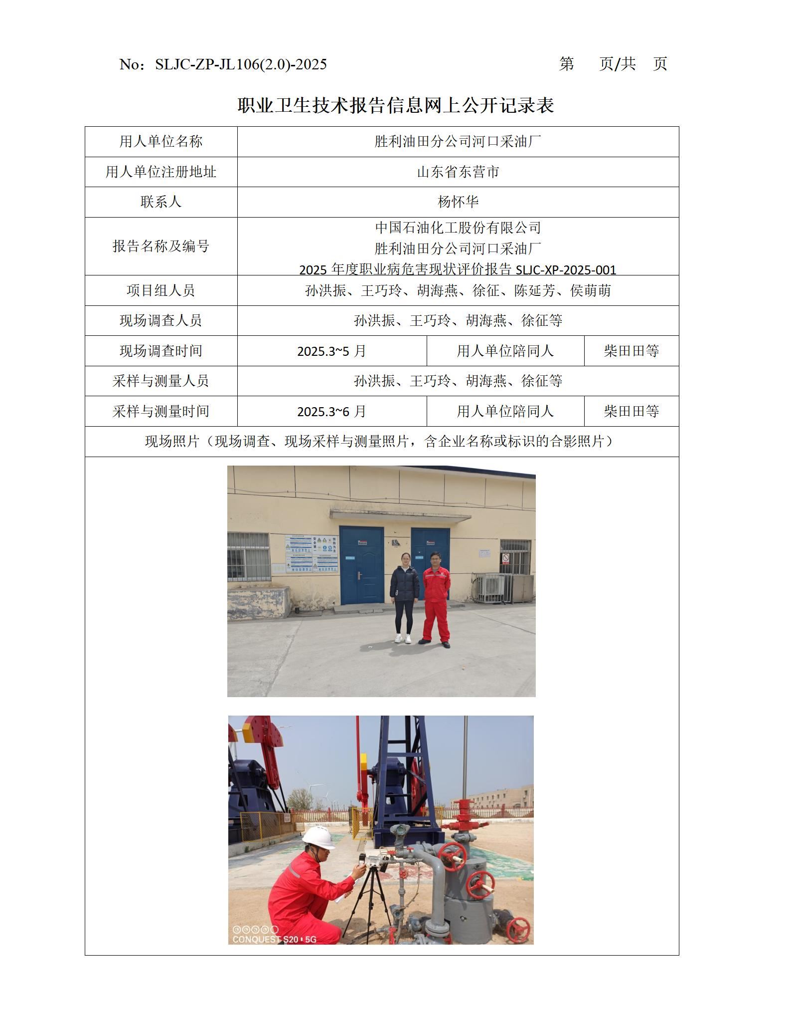 中国石油化工股份有限公司 胜利油田分公司河口采油厂 2025年度职业病危害现状评价报告SLJC-XP-2025-001