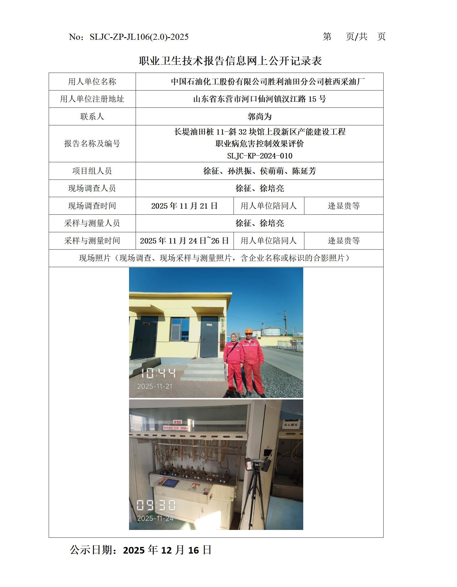 长堤油田桩11-斜32块馆上段新区产能建设工程 职业病危害控制效果评价 SLJC-KP-2024-010
