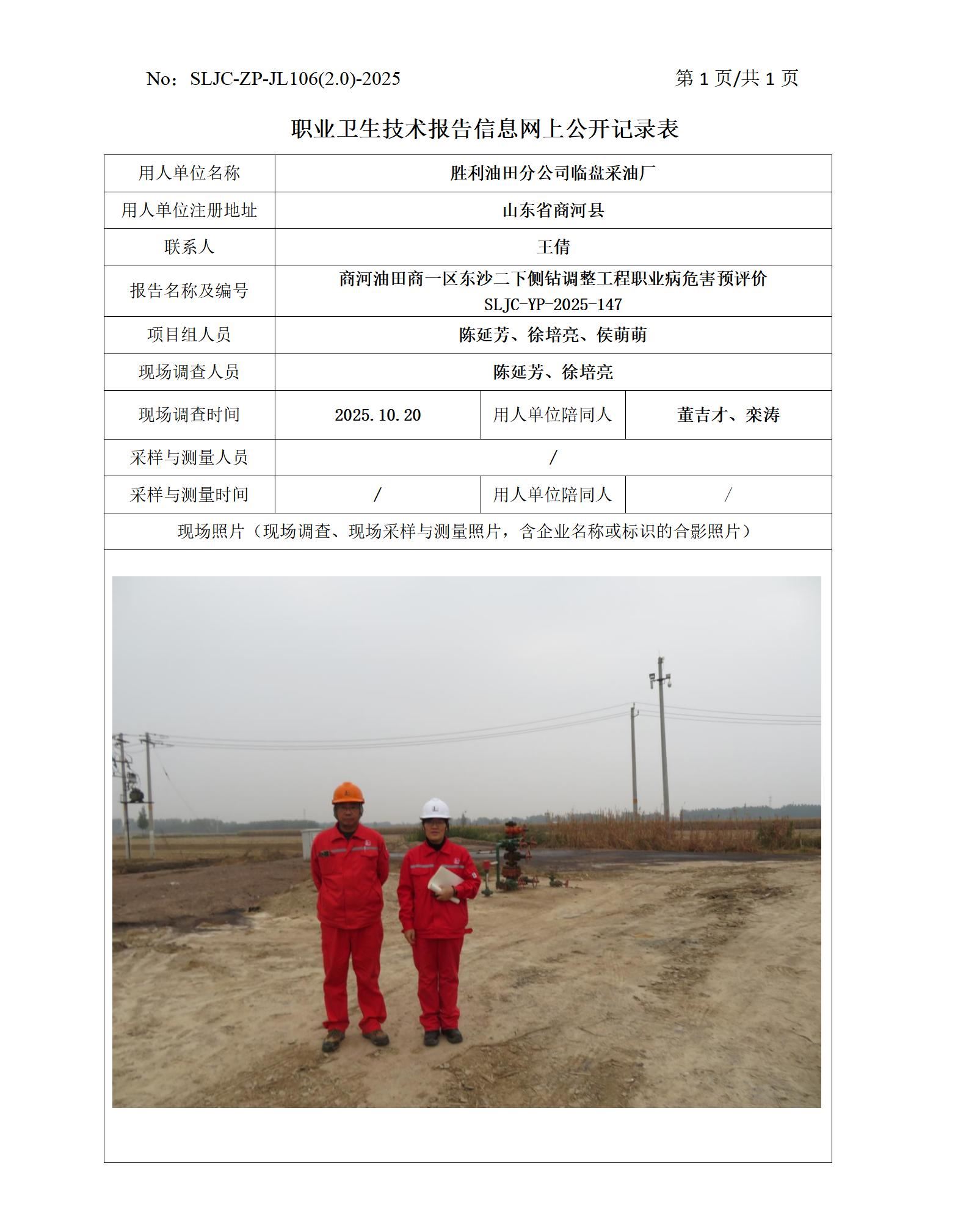 商河油田商一区东沙二下侧钻调整工程职业病危害预评价SLJC-YP-2025-147