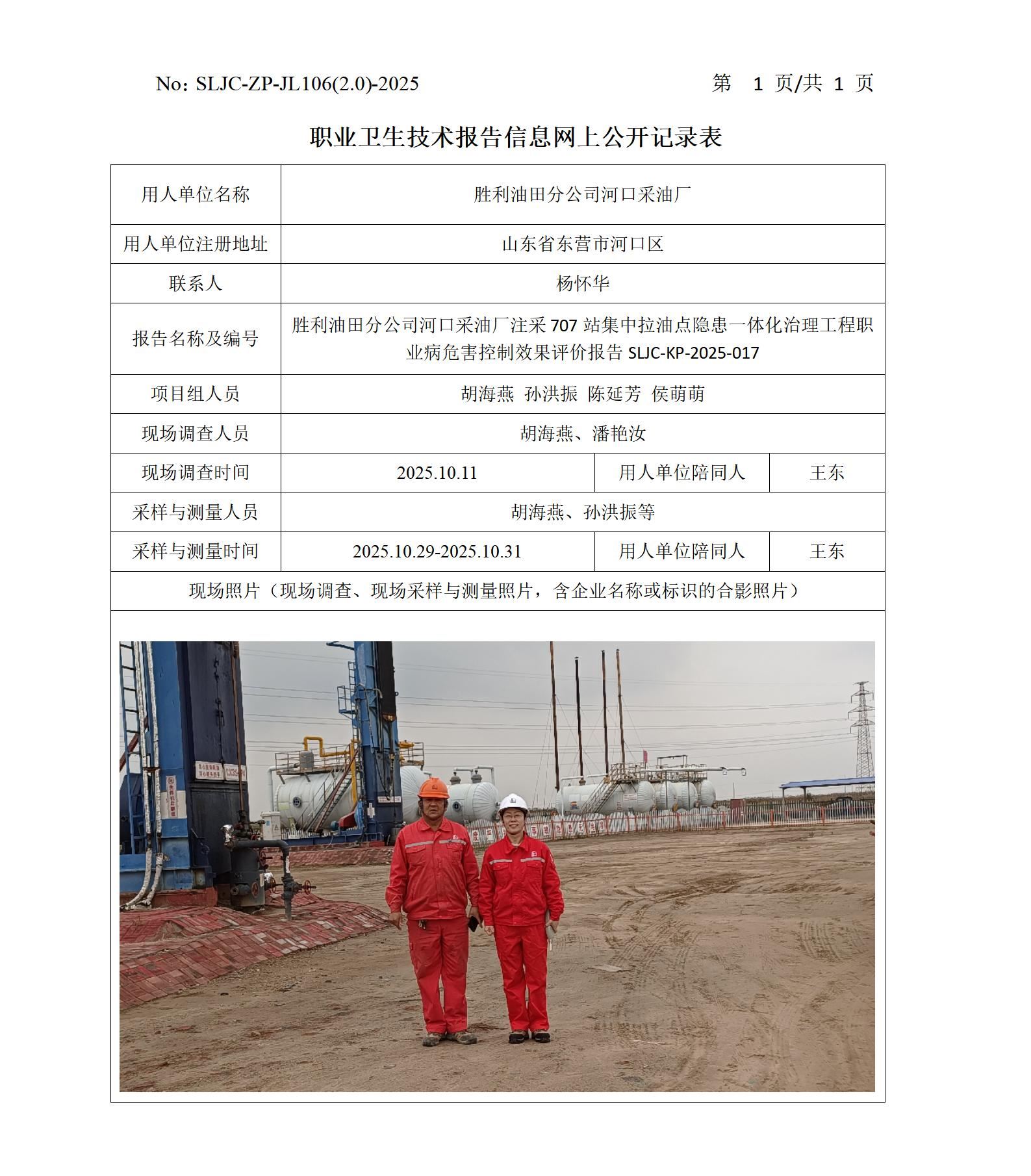 胜利油田分公司河口采油厂注采707站集中拉油点隐患一体化治理工程职业病危害控制效果评价报告SLJC-KP-2025-017