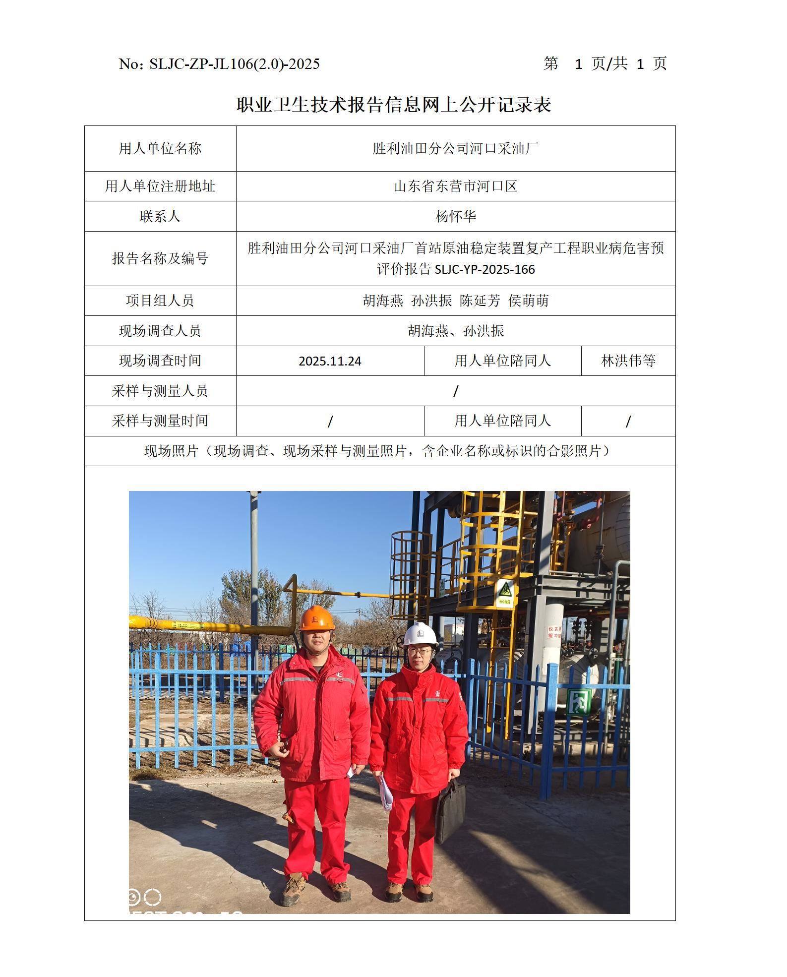 胜利油田分公司河口采油厂首站原油稳定装置复产工程职业病危害预评价报告SLJC-YP-2025-166