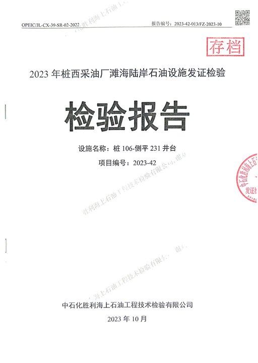 报告名称 | 2023年桩西采油厂滩海陆岸石油设施发证检验检验报告(桩106-侧平231井台) |