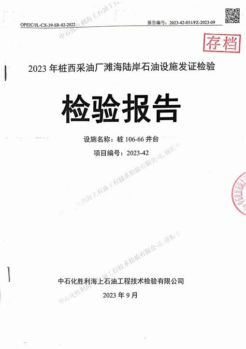 报告名称 | 2023年桩西采油厂滩海陆岸石油设施发证检验检验报告(桩106-66井台) |