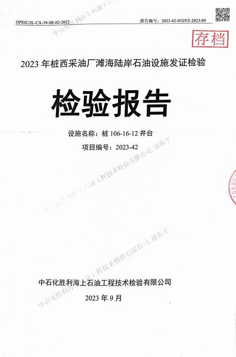 报告名称 | 2023年桩西采油厂滩海陆岸石油设施发证检验检验报告(桩106-16-12井组井台) |