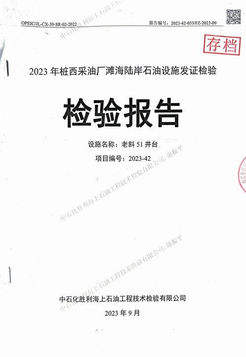 报告名称 | 2023年桩西采油厂滩海陆岸石油设施发证检验检验报告(老斜51井台) |