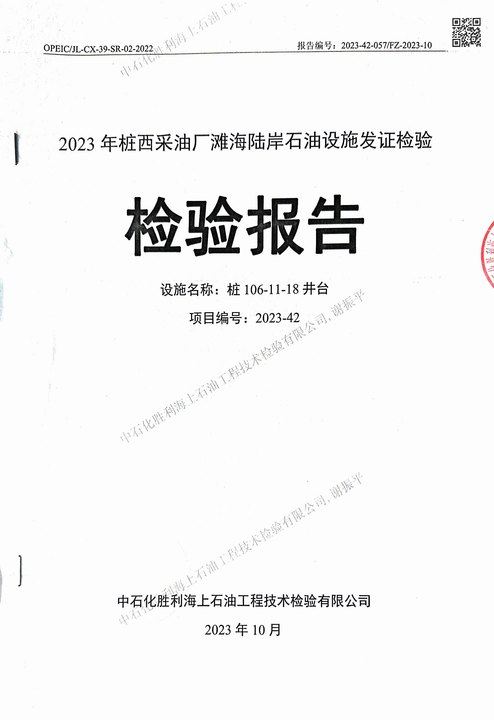 报告名称 | 2023年桩西采油厂滩海陆岸石油设施发证检验检验报告(桩106-11-18井台) |