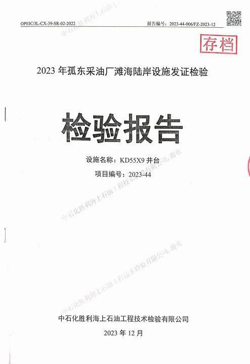 报告名称 | 2023年孤东采油厂滩海陆岸设施发证检验检验报告(KD55X9井台) |