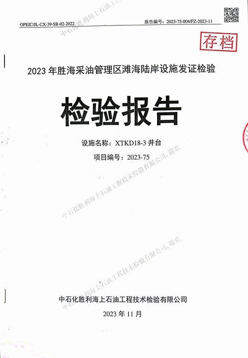 报告名称 | 2023年胜海采油管理区滩海陆岸设施发证检验检验报告(XTKD18-3井台) |