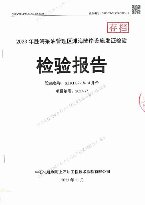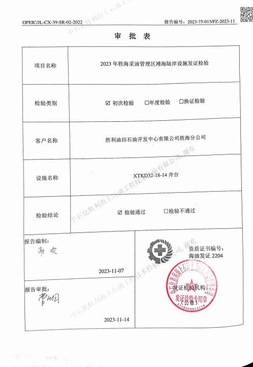 报告名称 | 2023年胜海采油管理区滩海陆岸设施发证检验检验报告(XTKD32-18-14井台) |