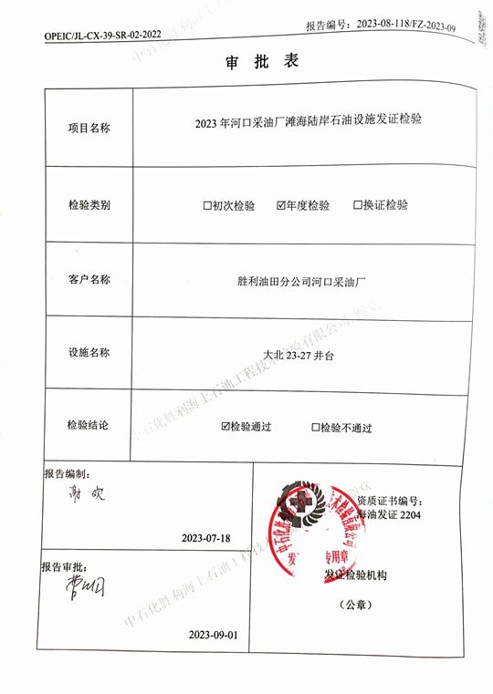 报告名称 | 2023年河口采油厂滩海陆岸石油设施发证检验检验报告(大北23-27井台) |
