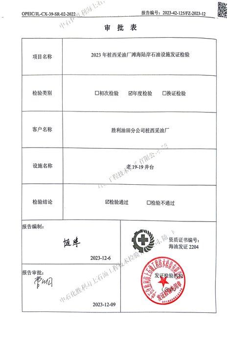 报告名称 | 2023年桩西采油厂滩海陆岸石油设施发证检验检验报告(老19-19井台) |