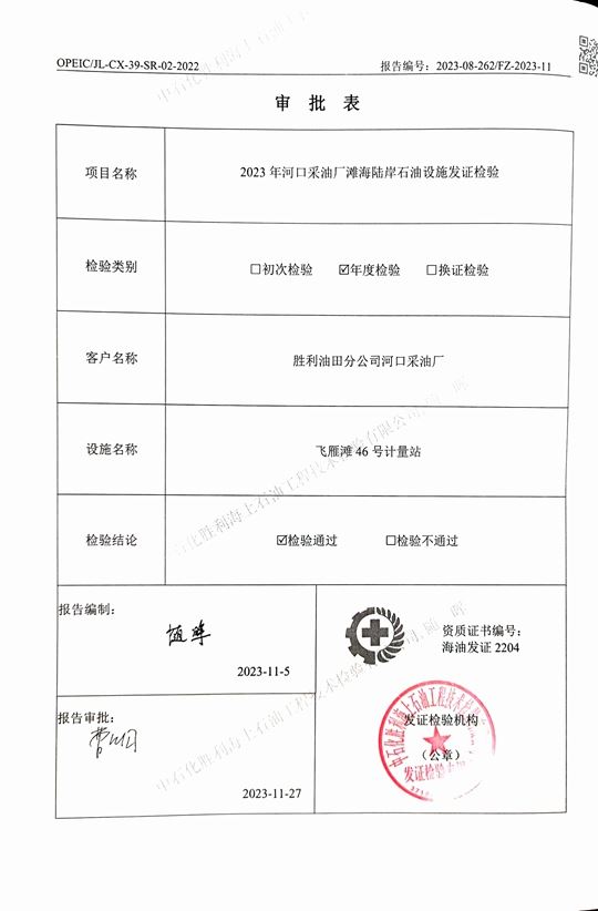 2023年河口采油厂滩海陆岸石油设施发证检验检验报告(飞雁滩46号计量站)