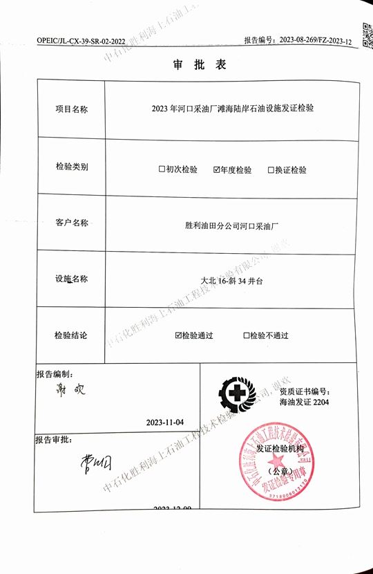 报告名称 | 2023年河口采油厂滩海陆岸石油设施发证检验检验报告(大北16-斜34井台) |