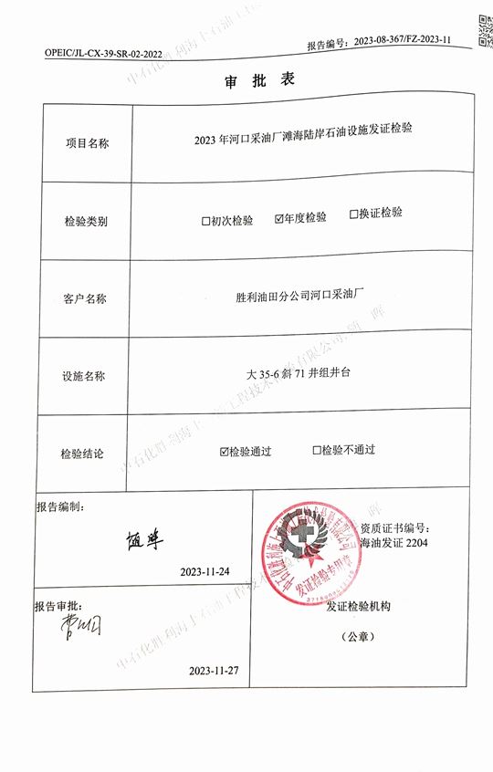 2023年河口采油厂滩海陆岸石油设施发证检验